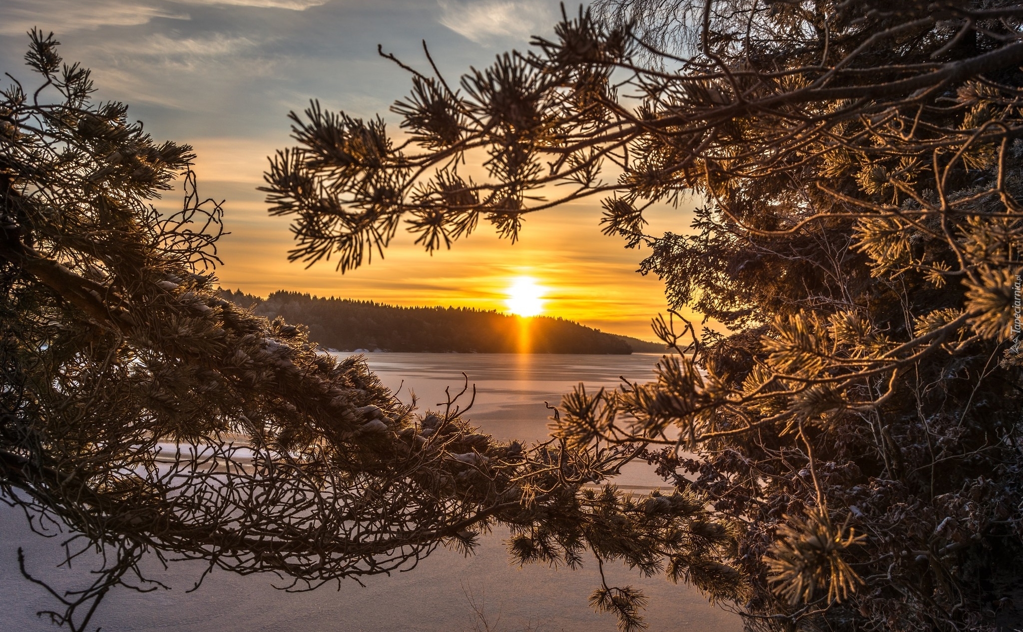Edytor tapety: Wschód słońca wschodzi nad lasem przy jeziorze