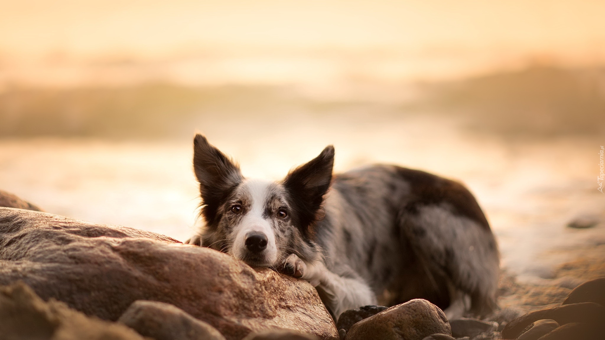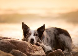 Edytor tapety: Border collie leżący na kamieniach