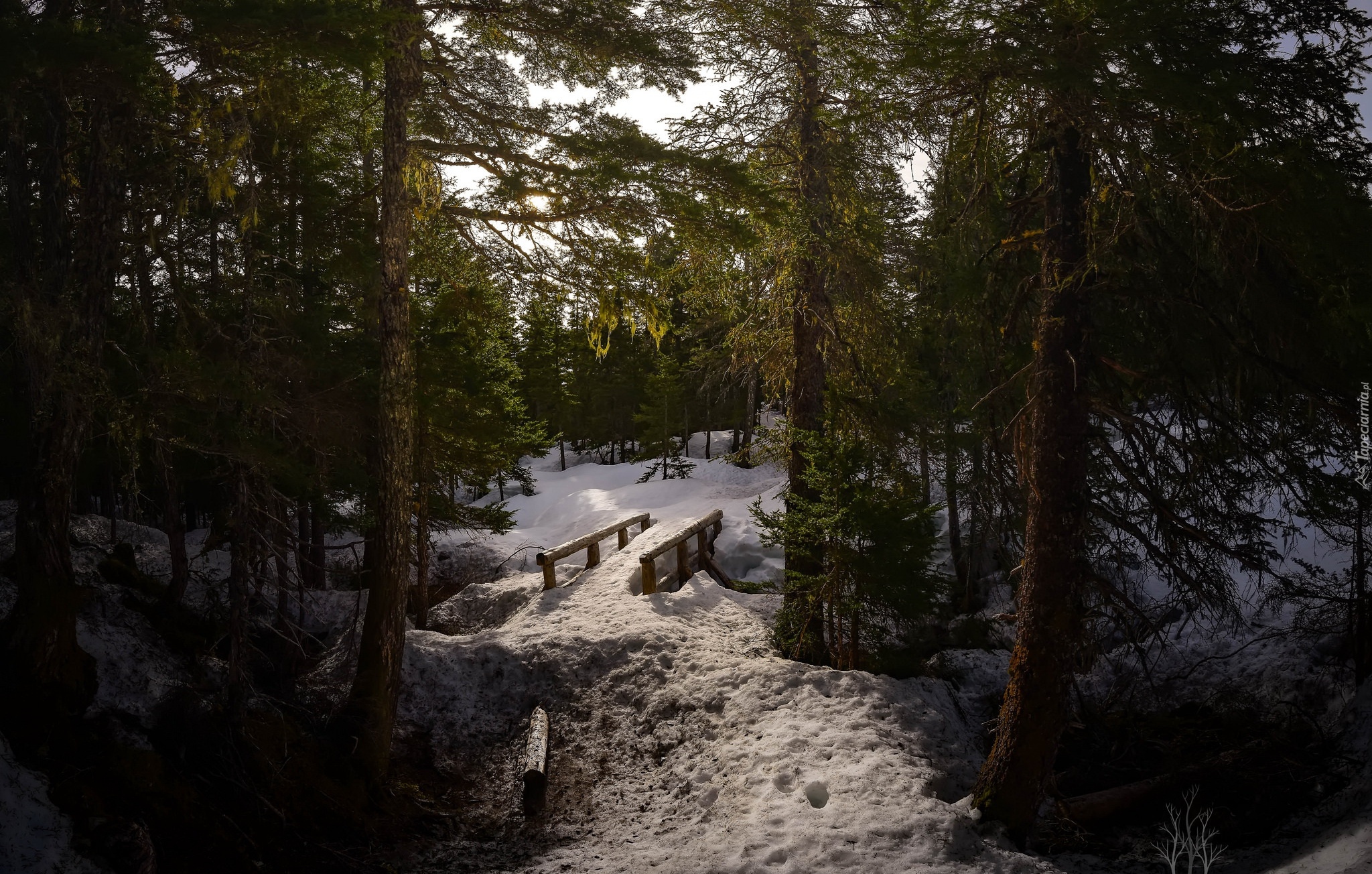 Edytor tapety: Mostek w lesie zasypany śniegiem