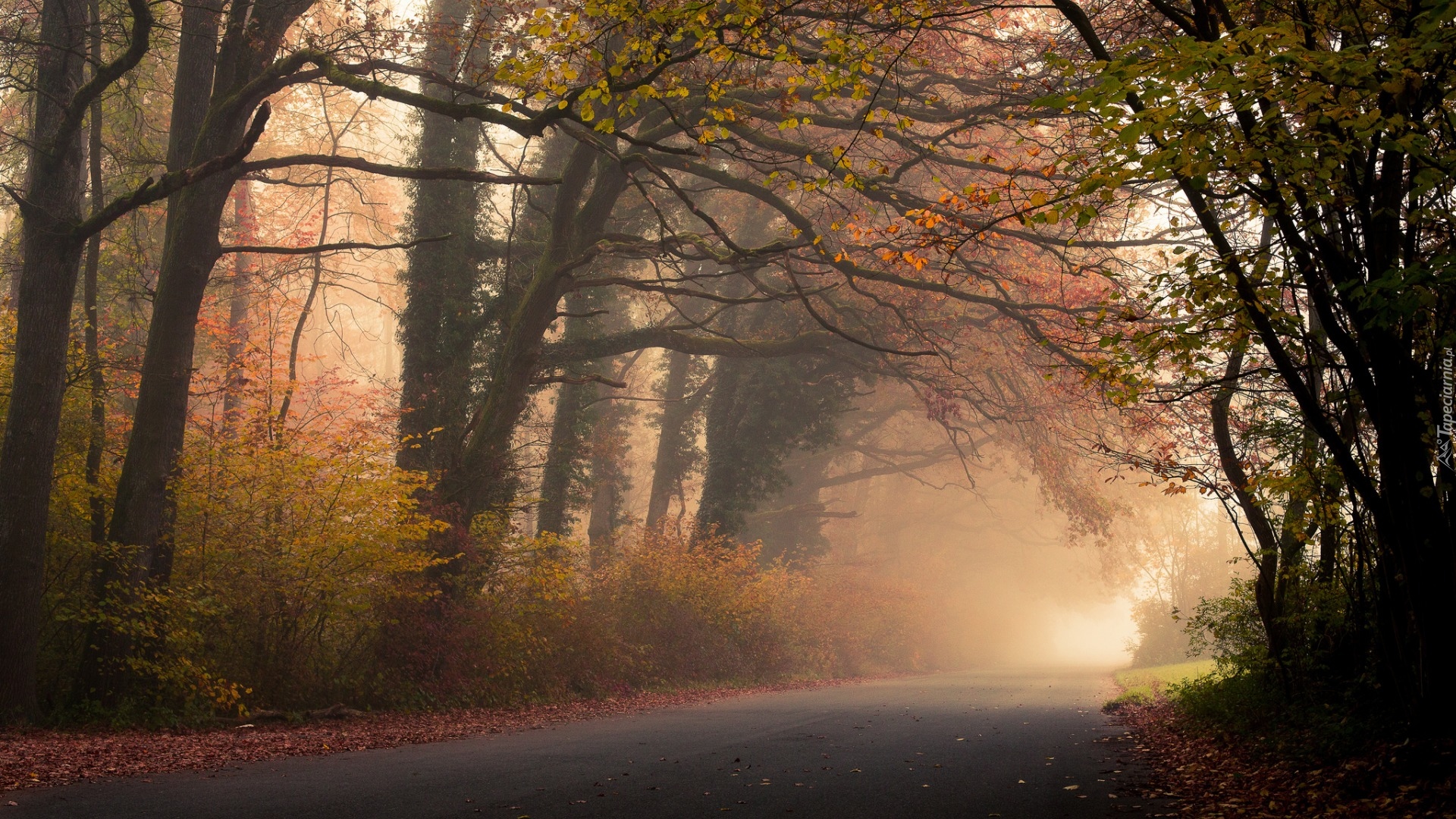 Edytor tapety: Droga przez las we mgle