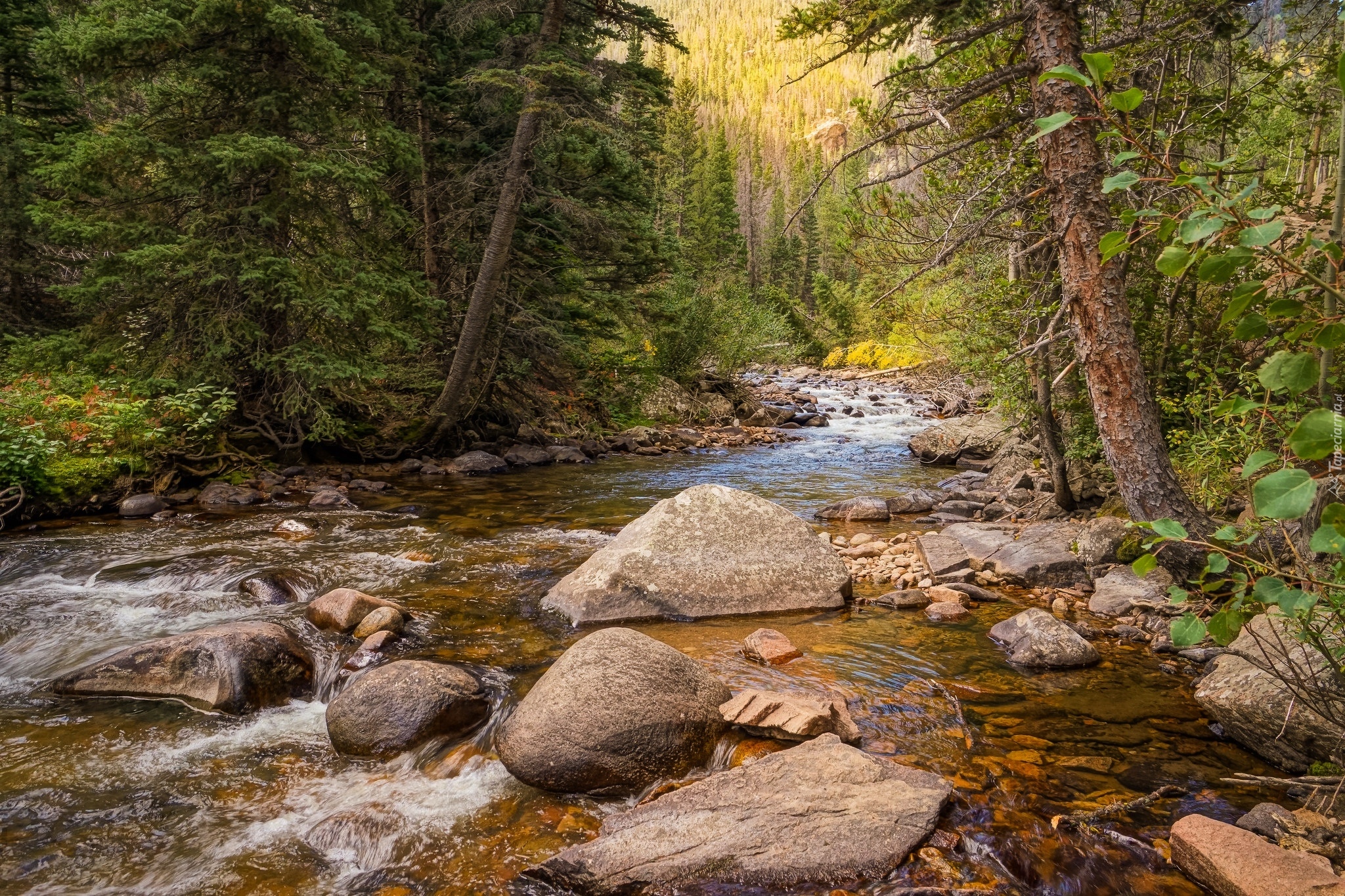 Edytor tapety: Kamienista rzeka płynąca wzdłuż lasu