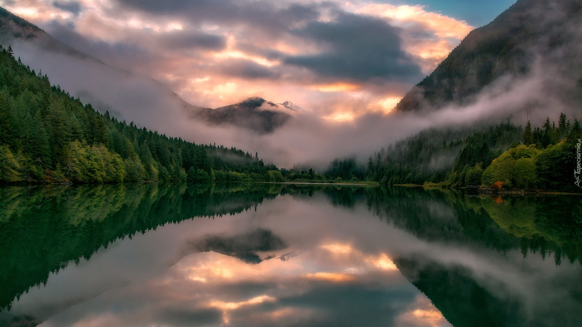 Edytor tapety: Zamglone drzewa odbijają się w jeziorze