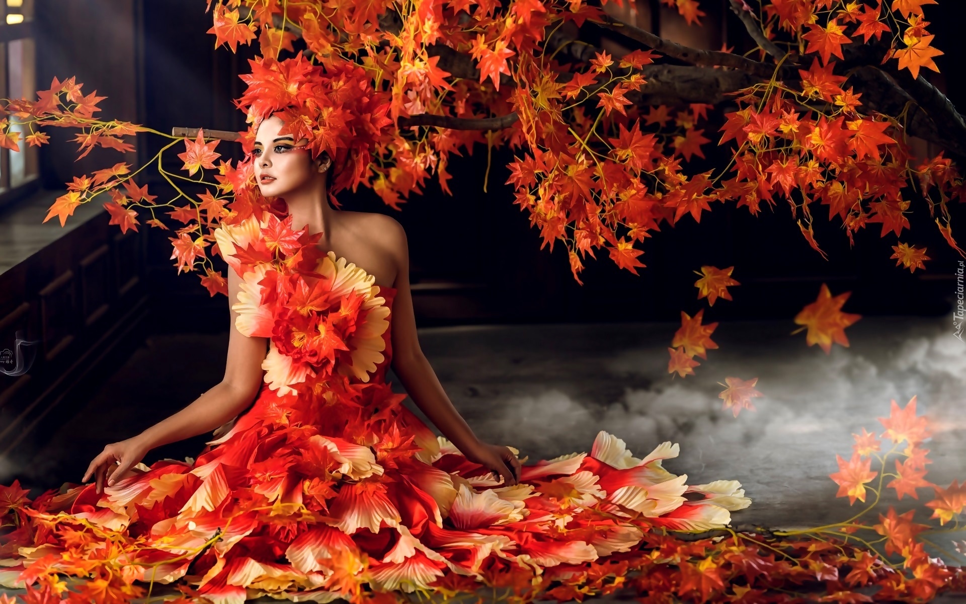 Edytor tapety: Kobieta ubrana w jesienne liście