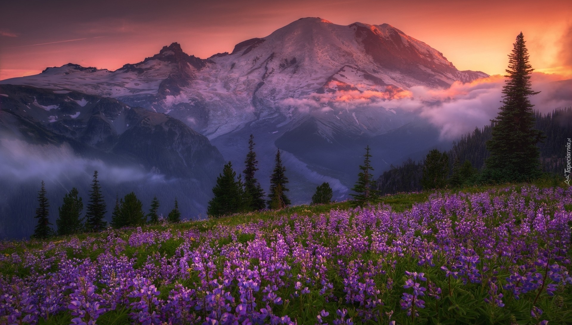 Edytor tapety: Łubinowa łąka z widokiem na stratowulkan Mount Rainier