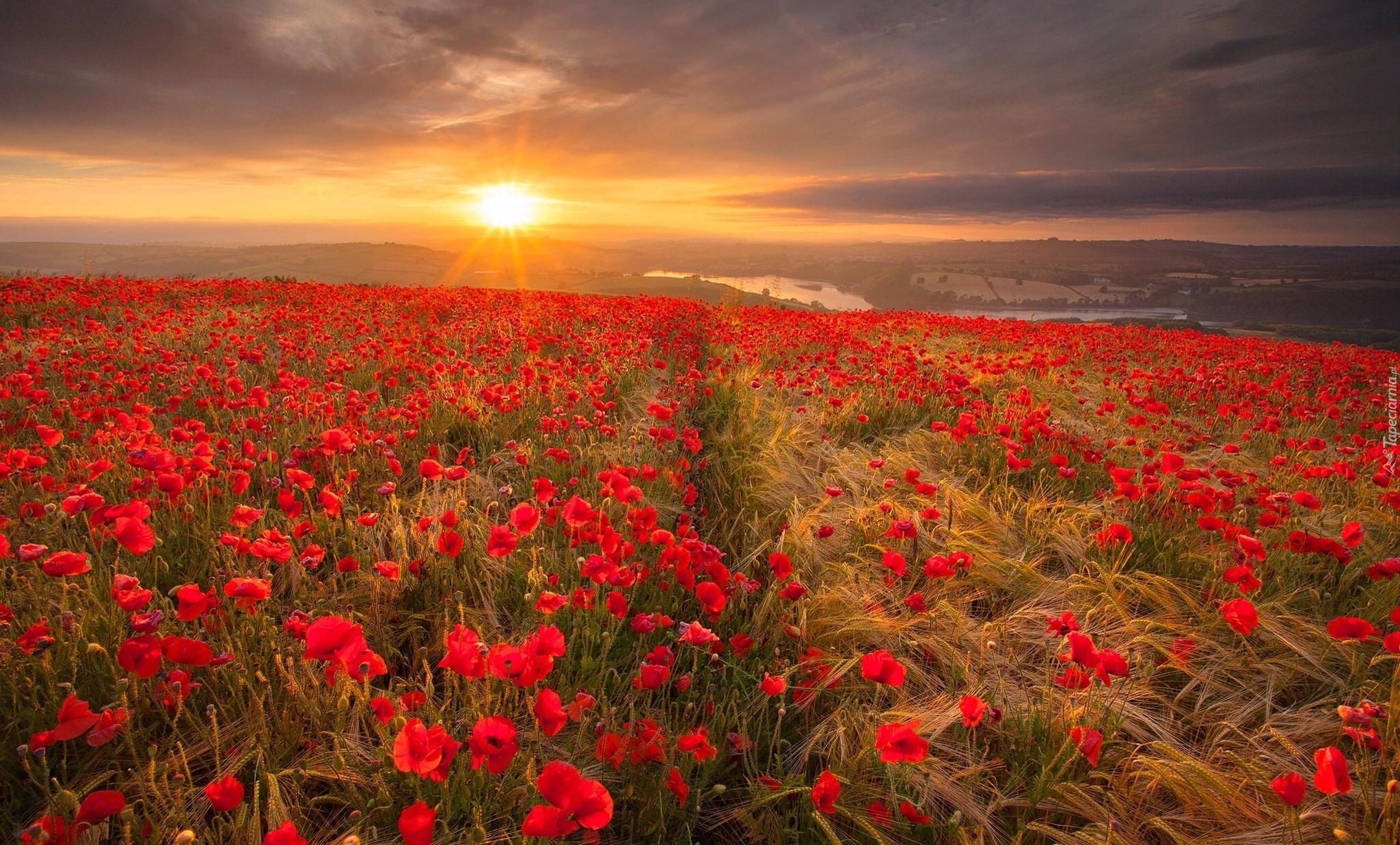 Edytor tapety: Zboże i maki w promieniach zachodzącego słońca