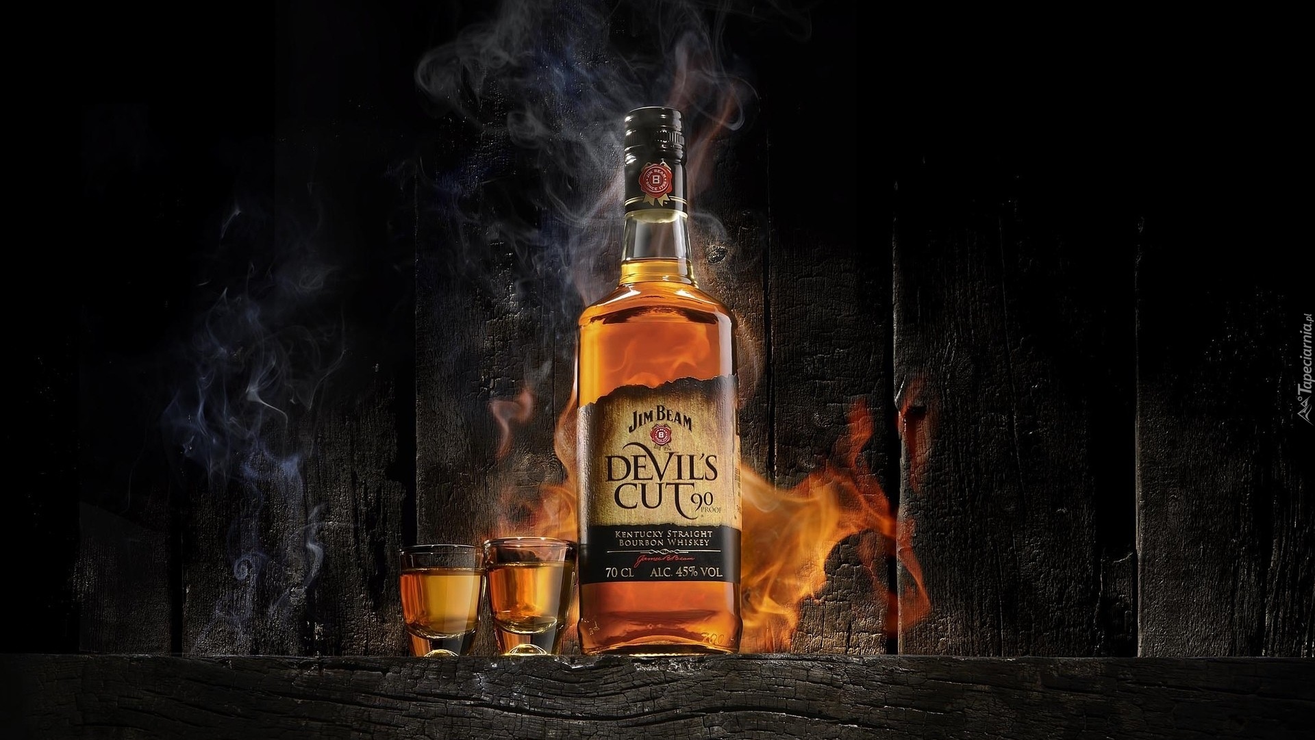 Edytor tapety: Kieliszki i butelka whisky postawione na deskach