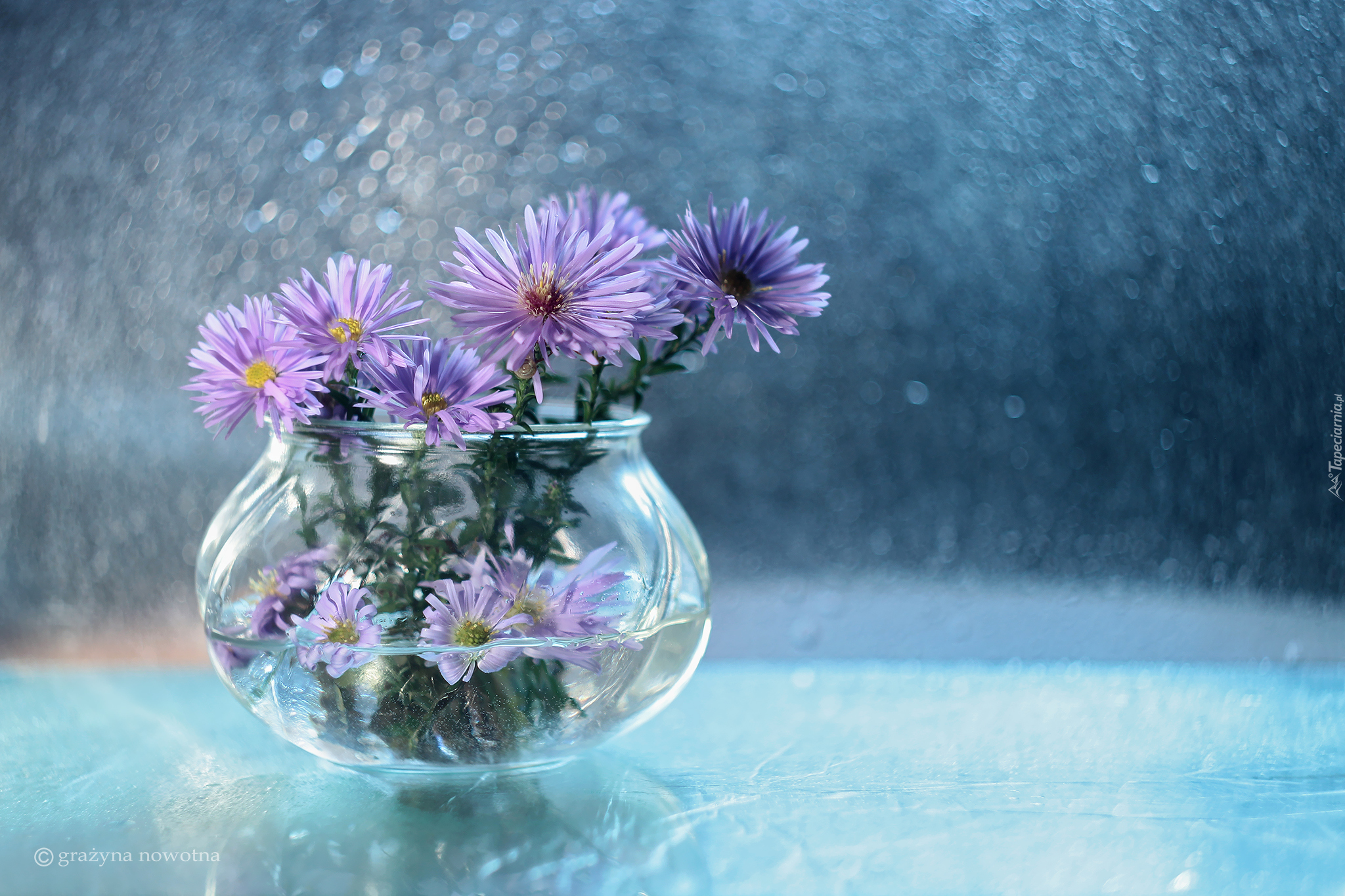 Edytor tapety: Fioletowe astry w szklanym wazoniku