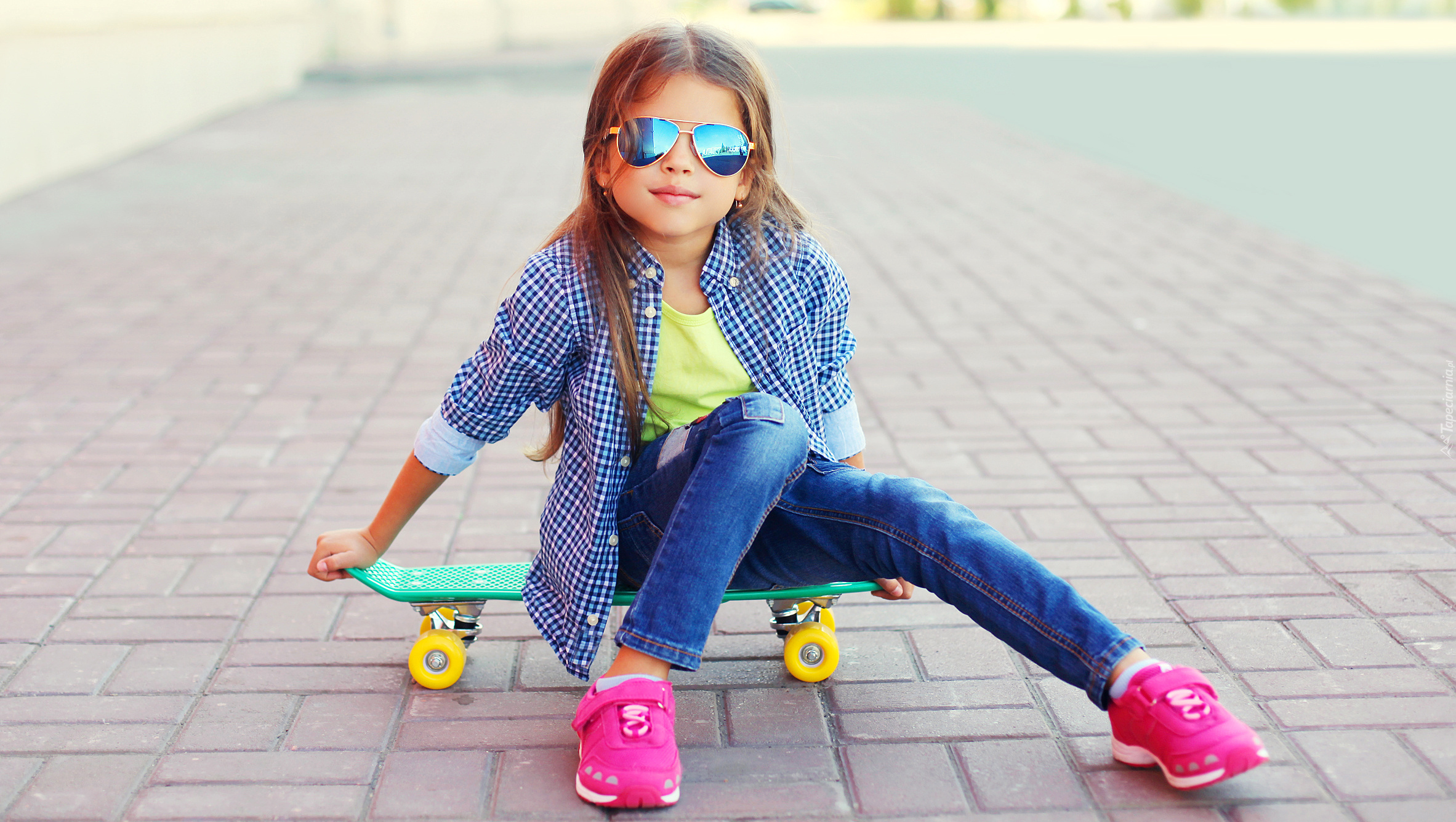 Edytor tapety: Dziewczynka w okularach przeciwsłonecznych na deskorolce