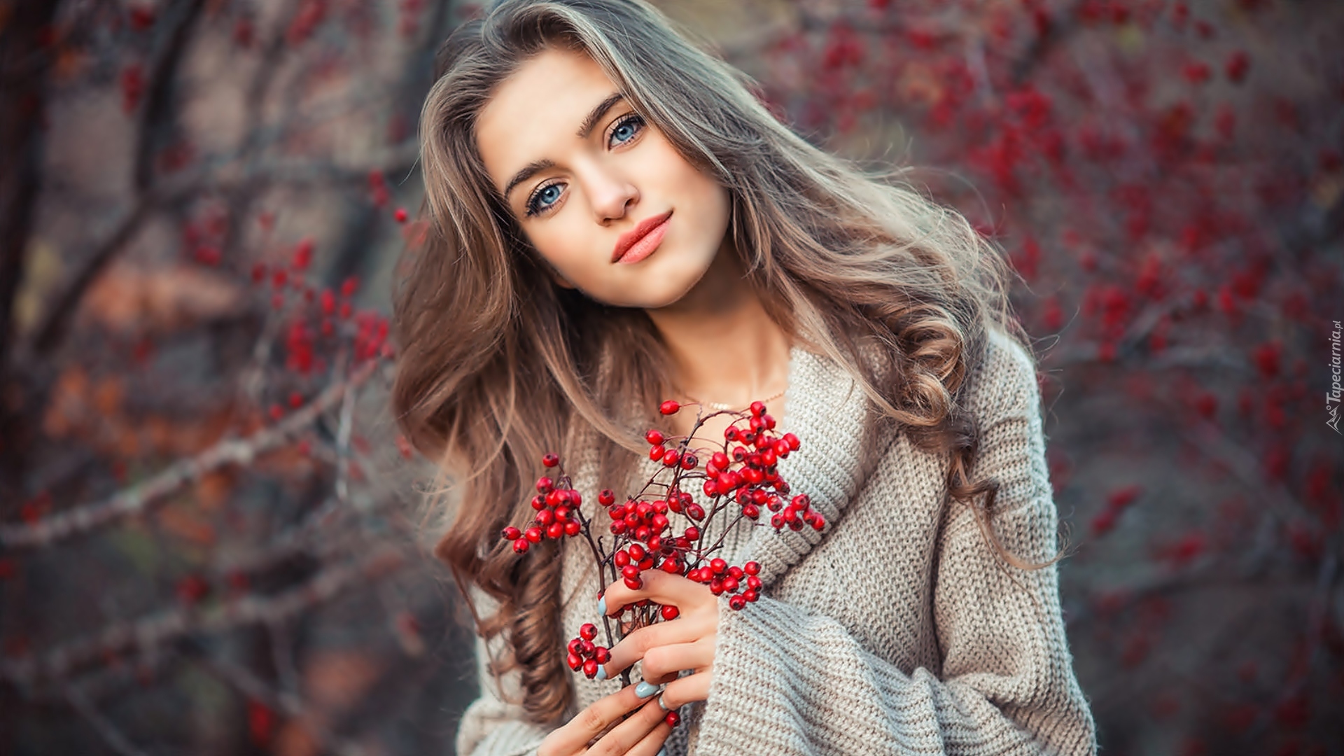 Edytor tapety: Dziewczyna z gałązką głogu w dłoniach