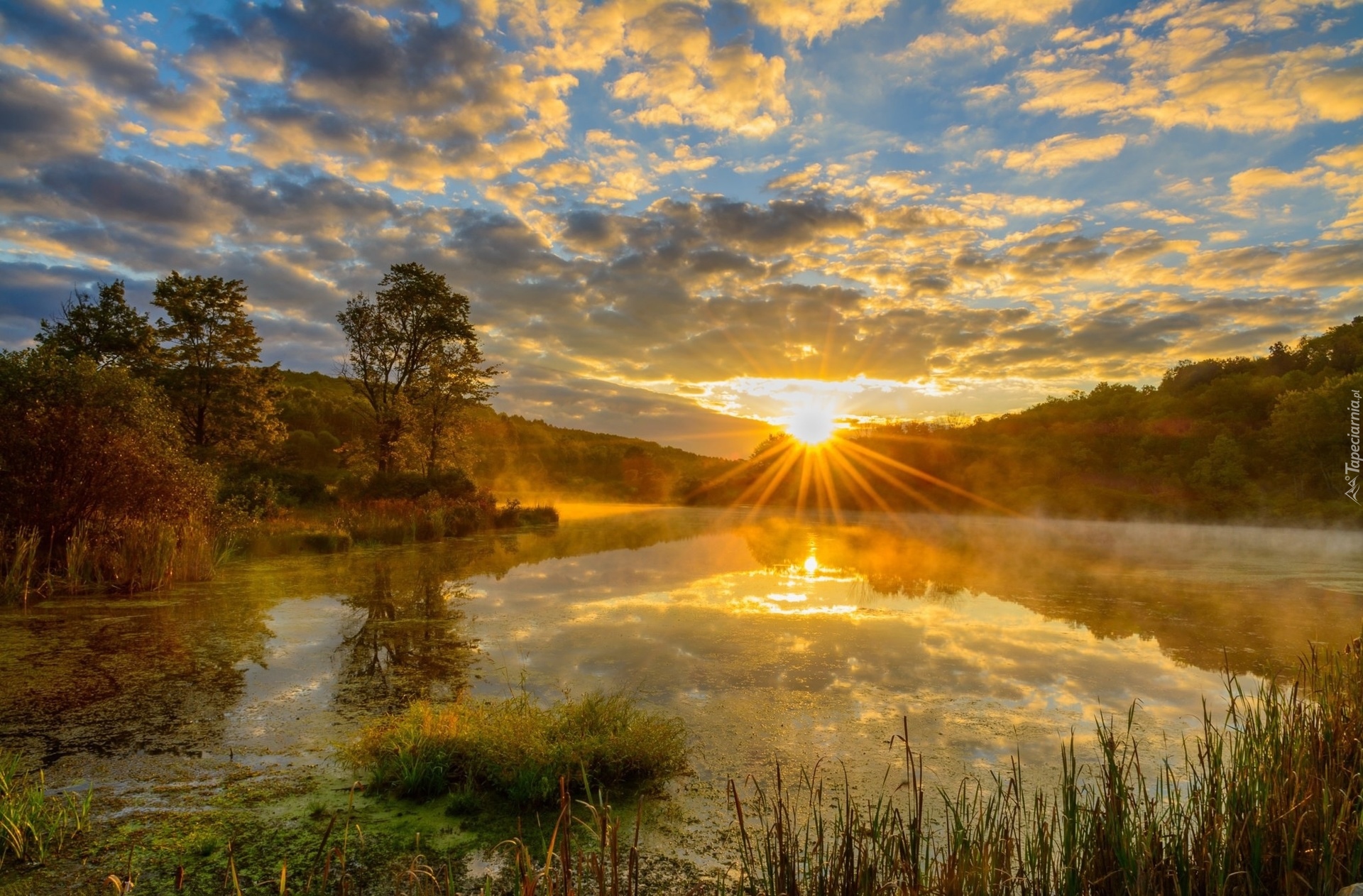 Edytor tapety: Szuwary na jeziorze w promieniach wschodzącego słońca