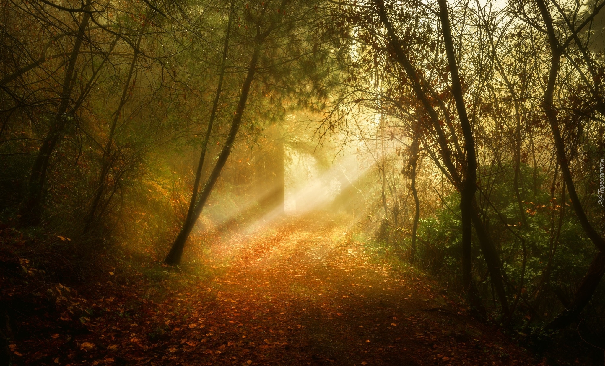 Edytor tapety: Las w promieniach słońca jesienną porą