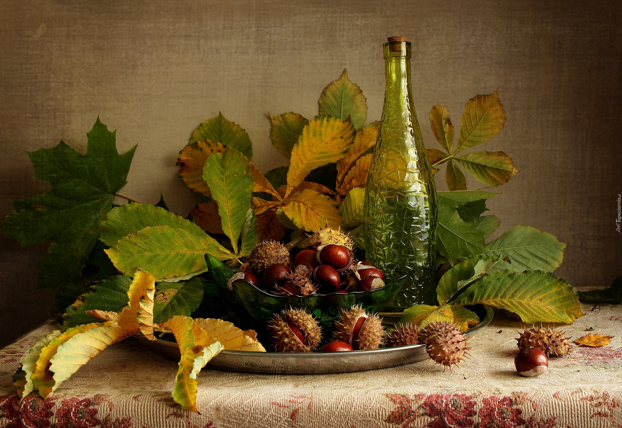 Edytor tapety: Jesienna kompozycja z kasztanami, liśćmi i butelką