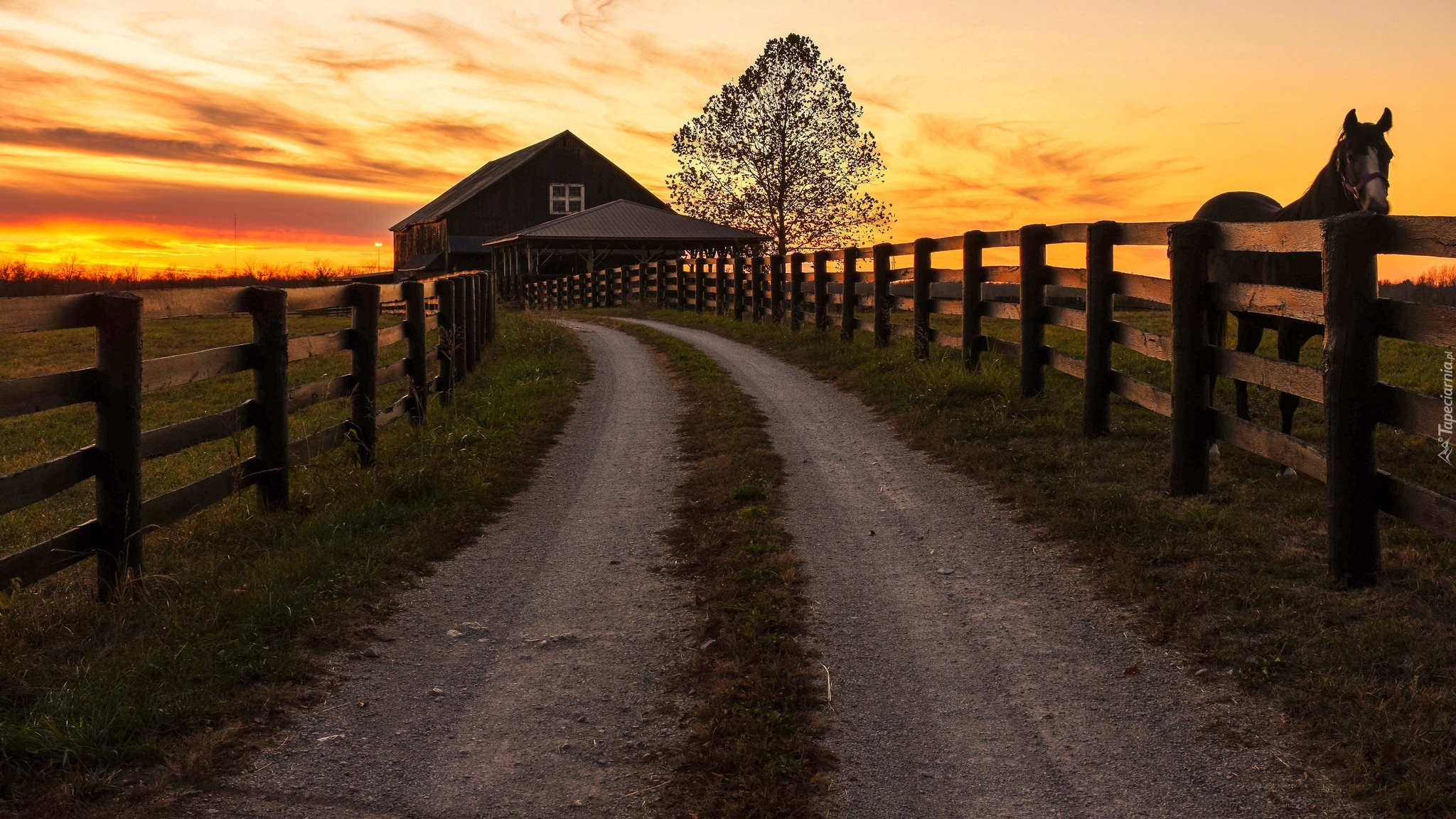 Edytor tapety: Droga wzdłuż ogrodzenia prowadząca do zabudowań