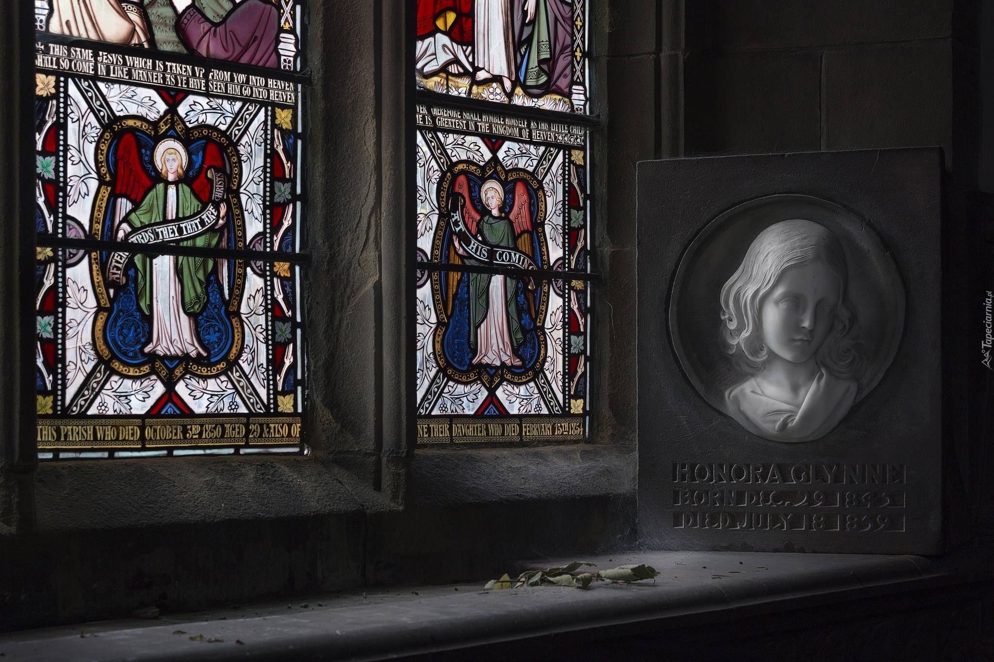 Edytor tapety: Witraż okienny obok portretu kobiety na kamiennej tablicy