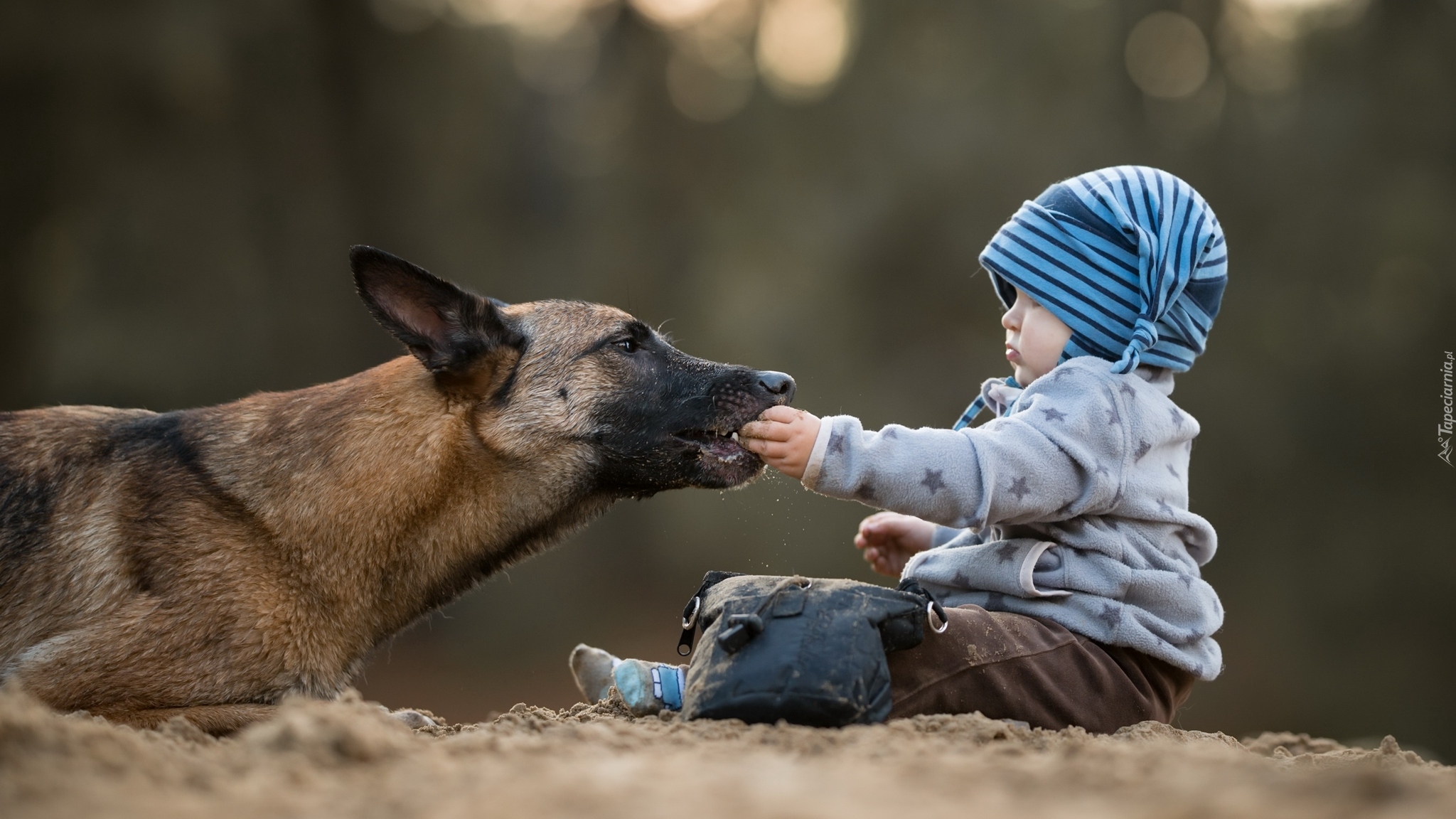 Edytor tapety: Dziecko karmiące owczarka belgijskiego malinois