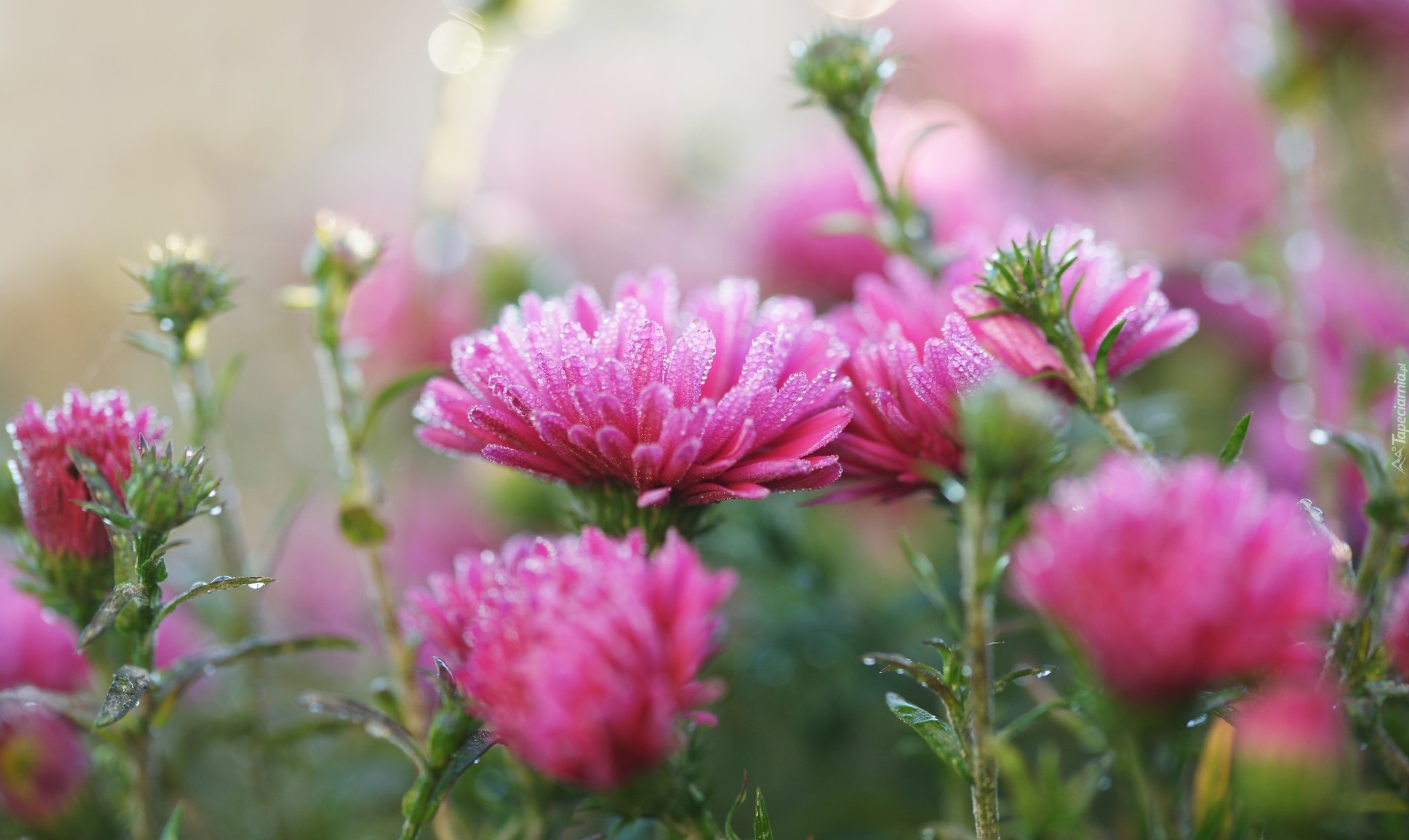 Edytor tapety: Krople wody na różowych astrach