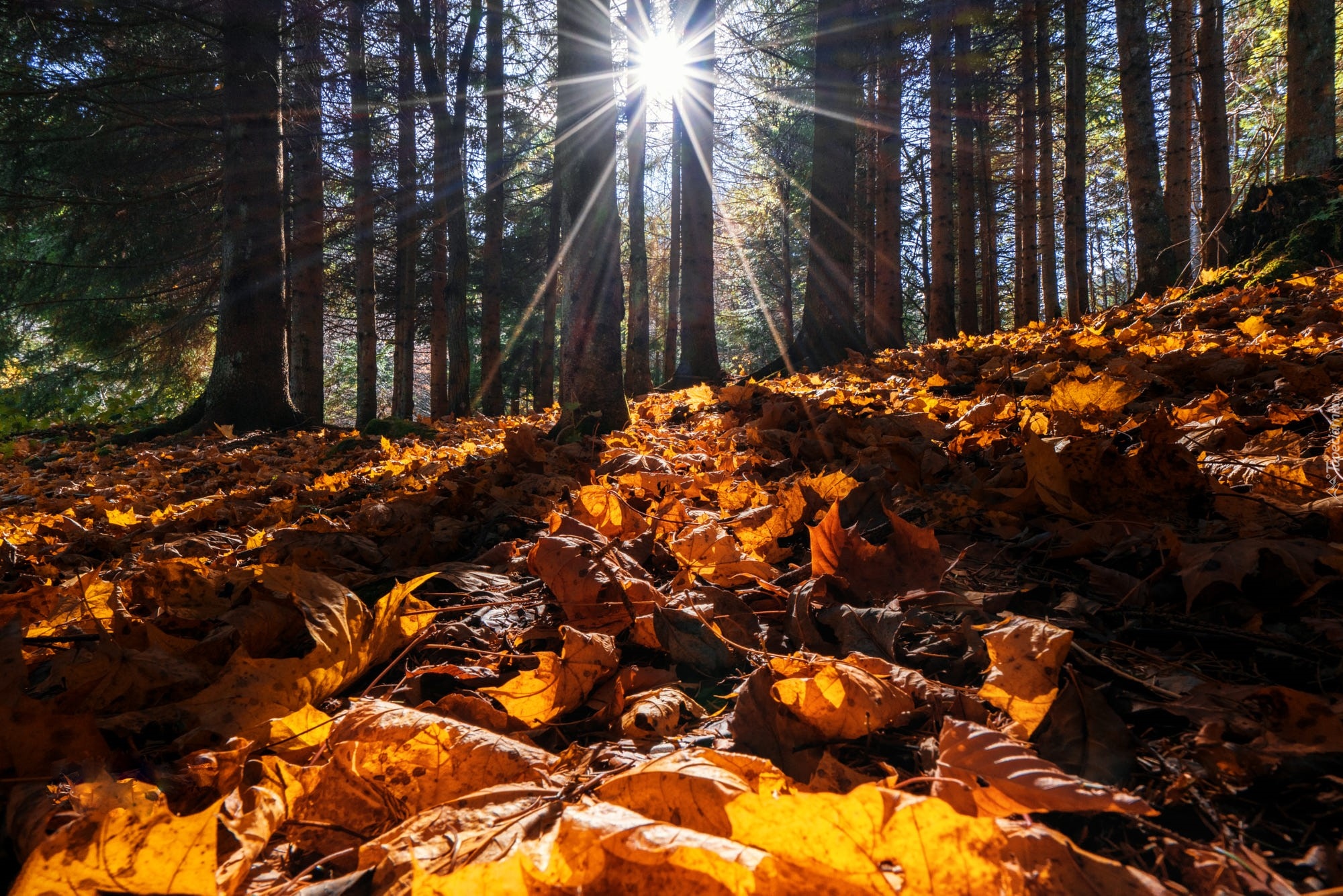 Edytor tapety: Promienie słońca między drzewami padają na jesienne liście