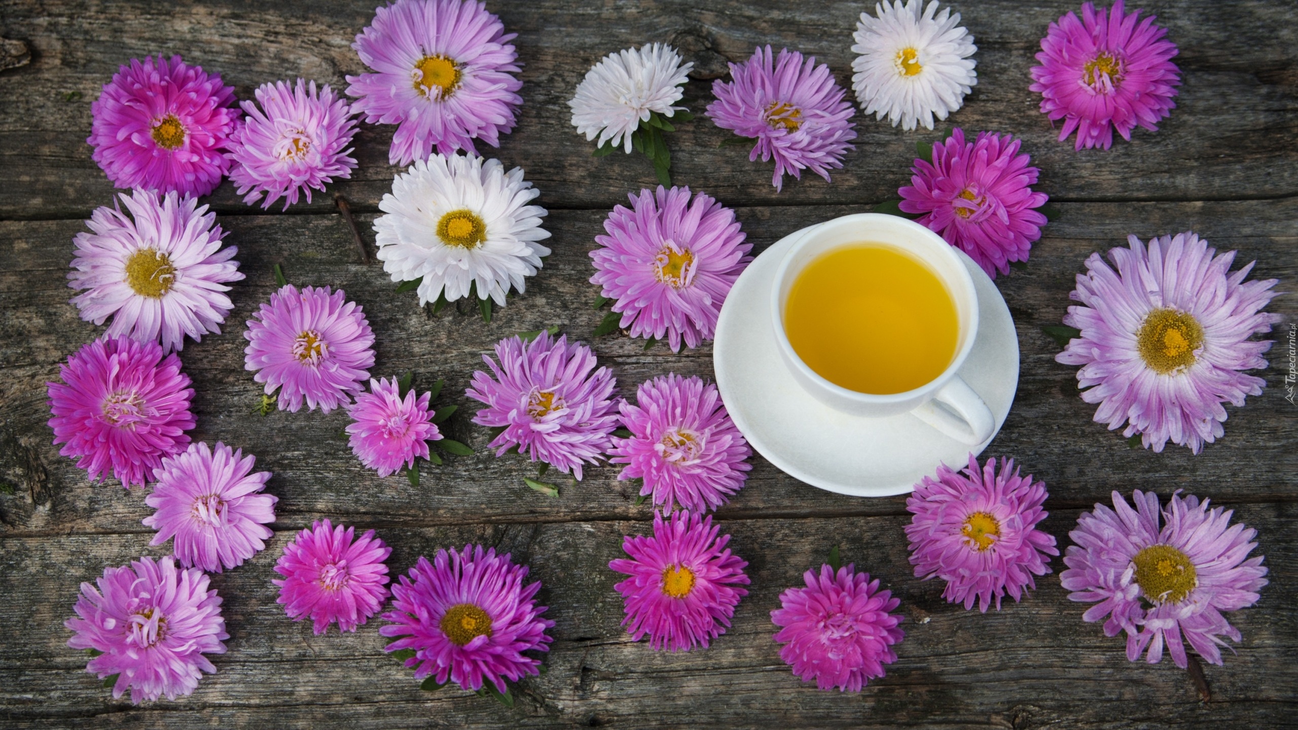 Edytor tapety: Astry ułożone na deskach obok filiżanki