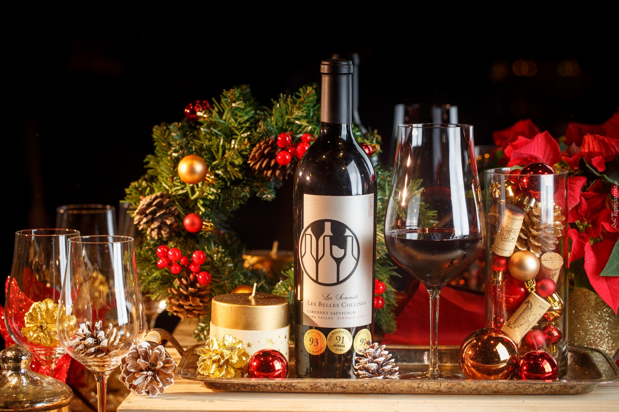 Edytor tapety: Świąteczny stroik obok kieliszków wina i świec