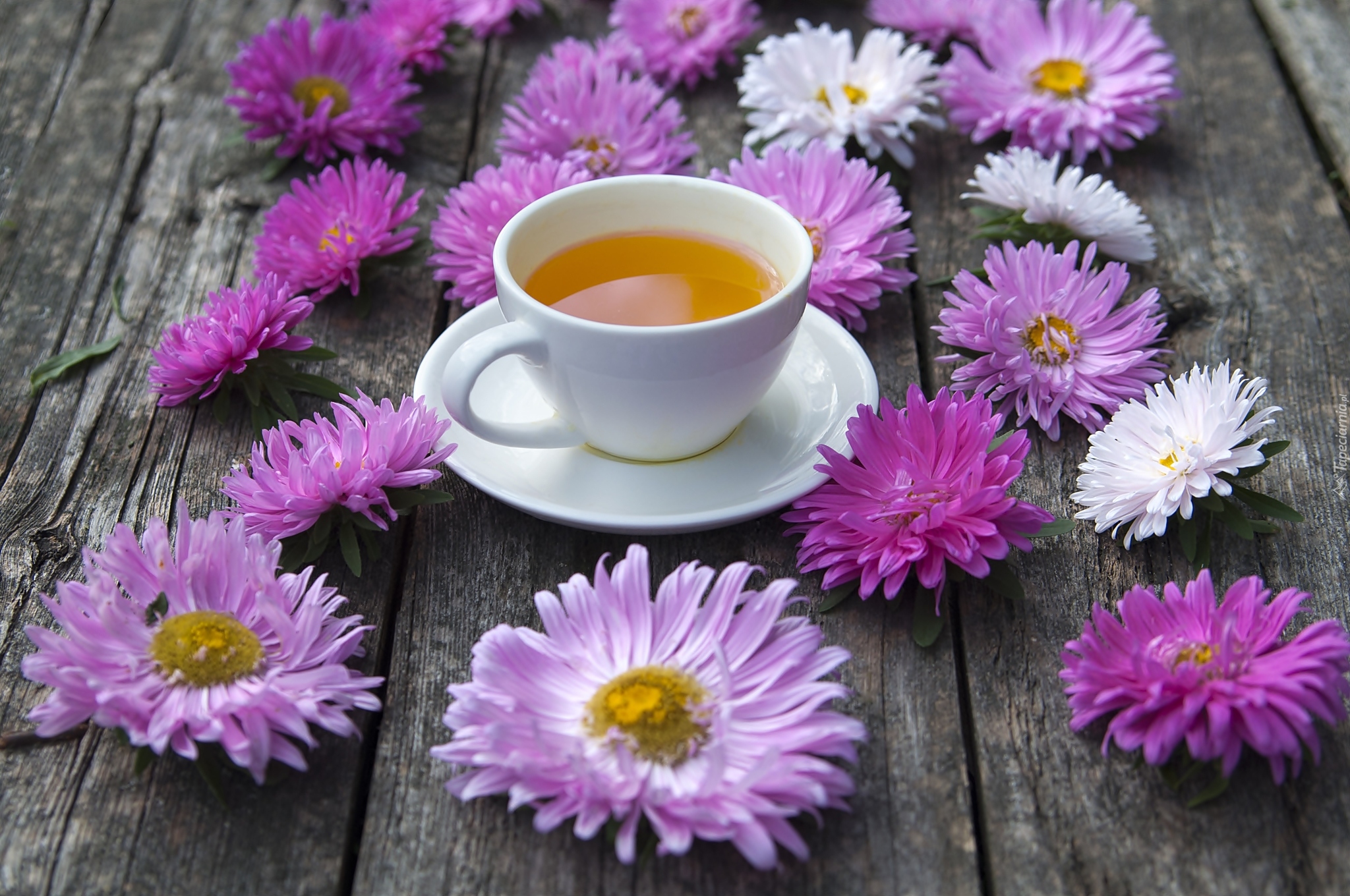Edytor tapety: Herbata w białej filiżance pośród astrów
