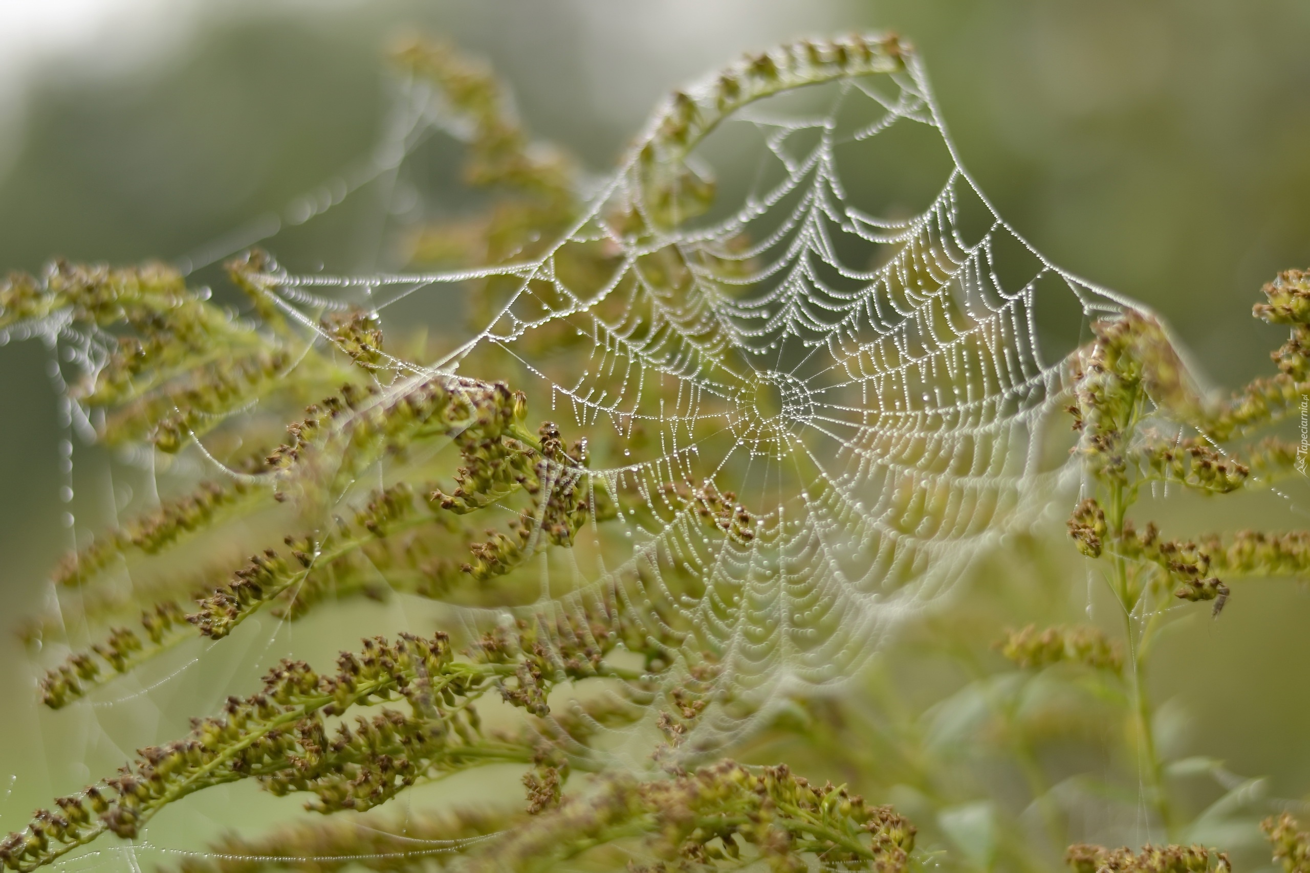 Edytor tapety: Pajęczyna w kroplach wody na roślinach