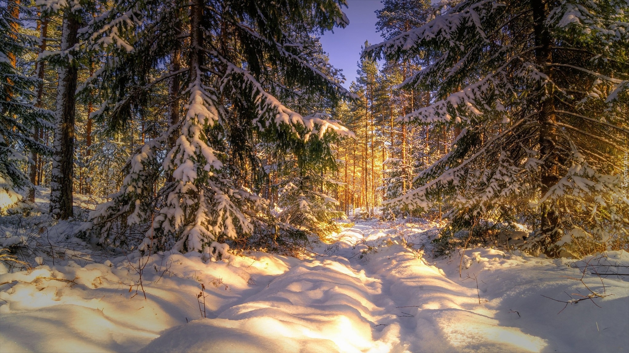 Edytor tapety: Zaśnieżony las w promieniach słońca