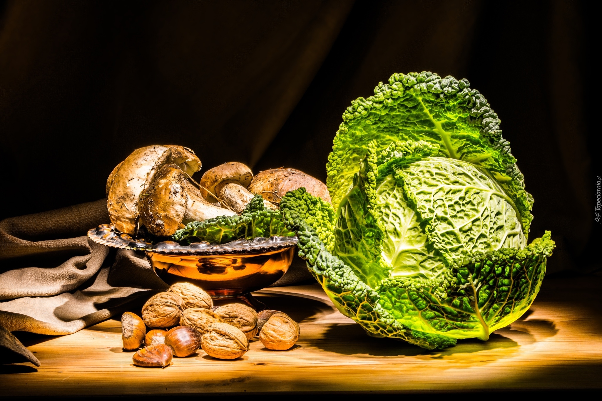 Edytor tapety: Kapusta i orzechy obok grzybów na paterze