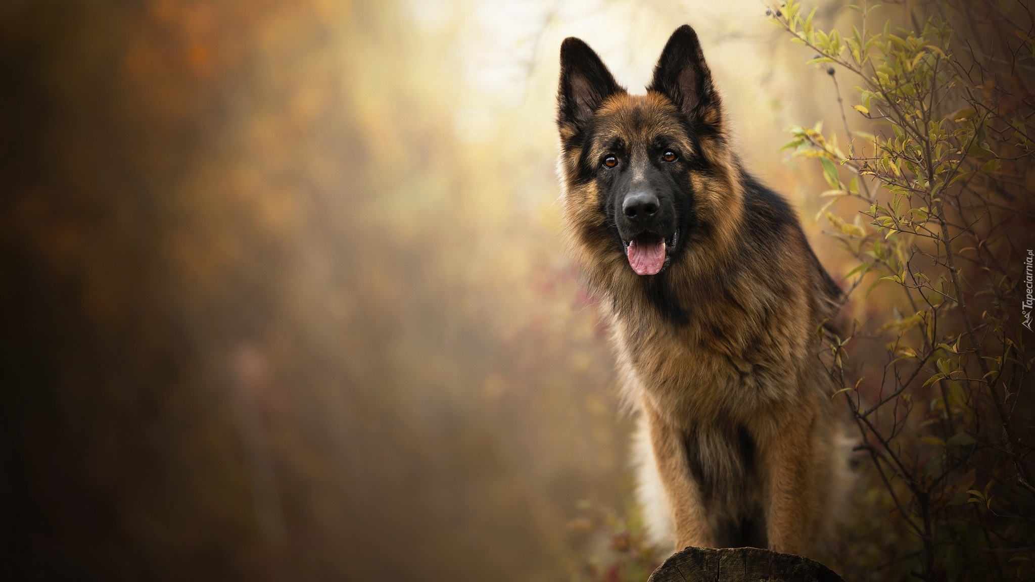 Edytor tapety: Owczarek niemiecki przy krzewach