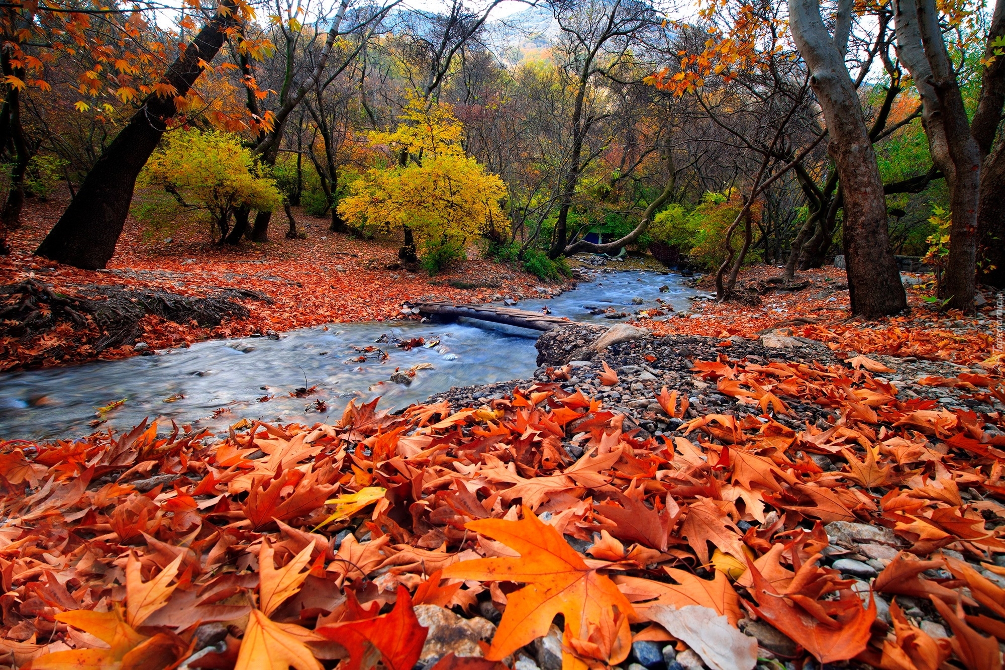 Edytor tapety: Rzeka z kładką w lesie
