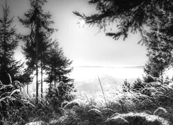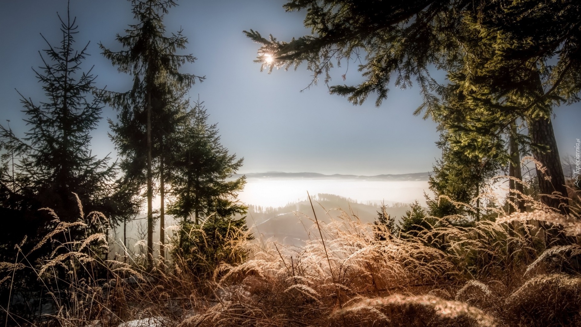 Edytor tapety: Drzewa i trawy na tle przymglonych wzgórz
