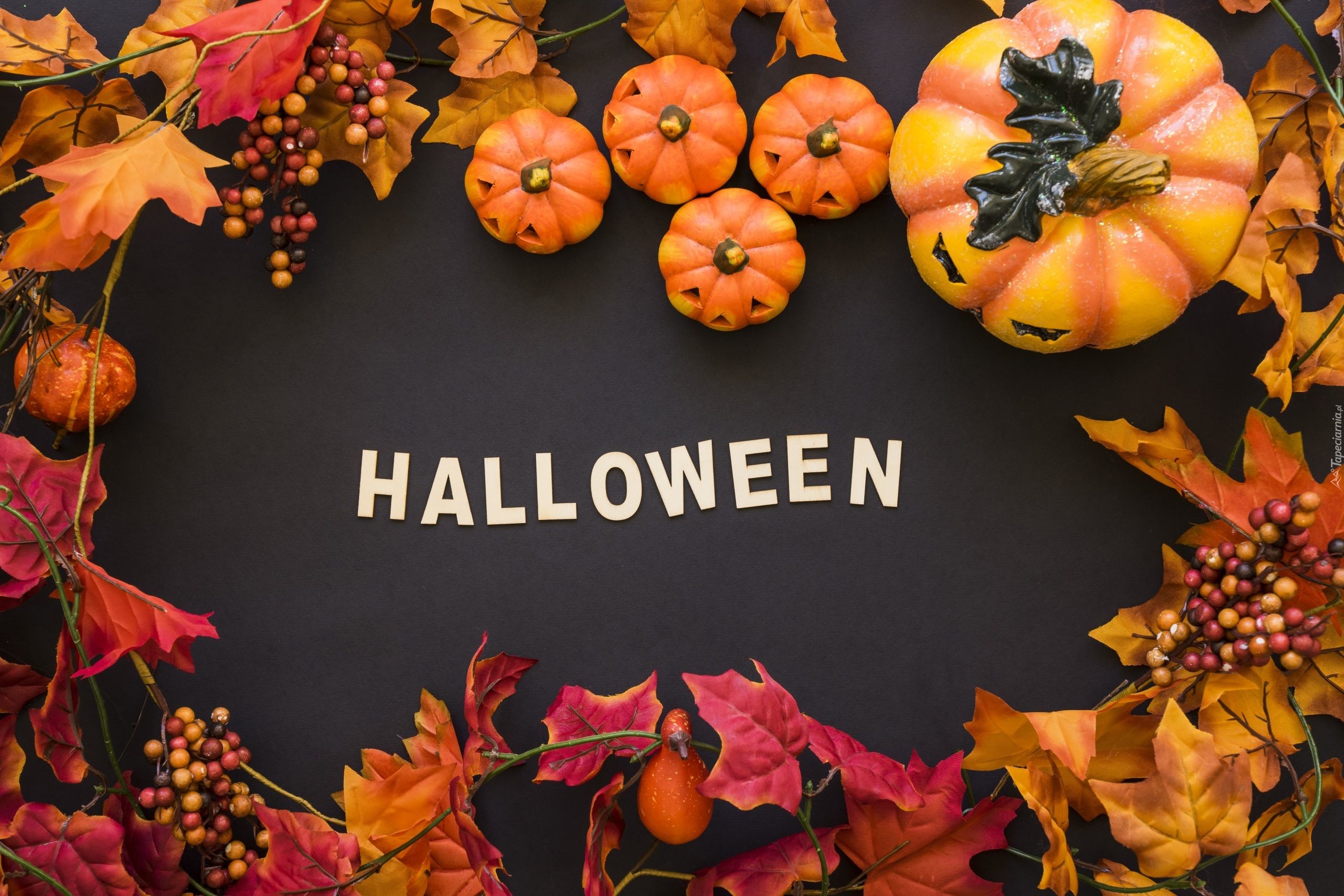 Edytor tapety: Napis Halloween otoczony dyniami i liśćmi