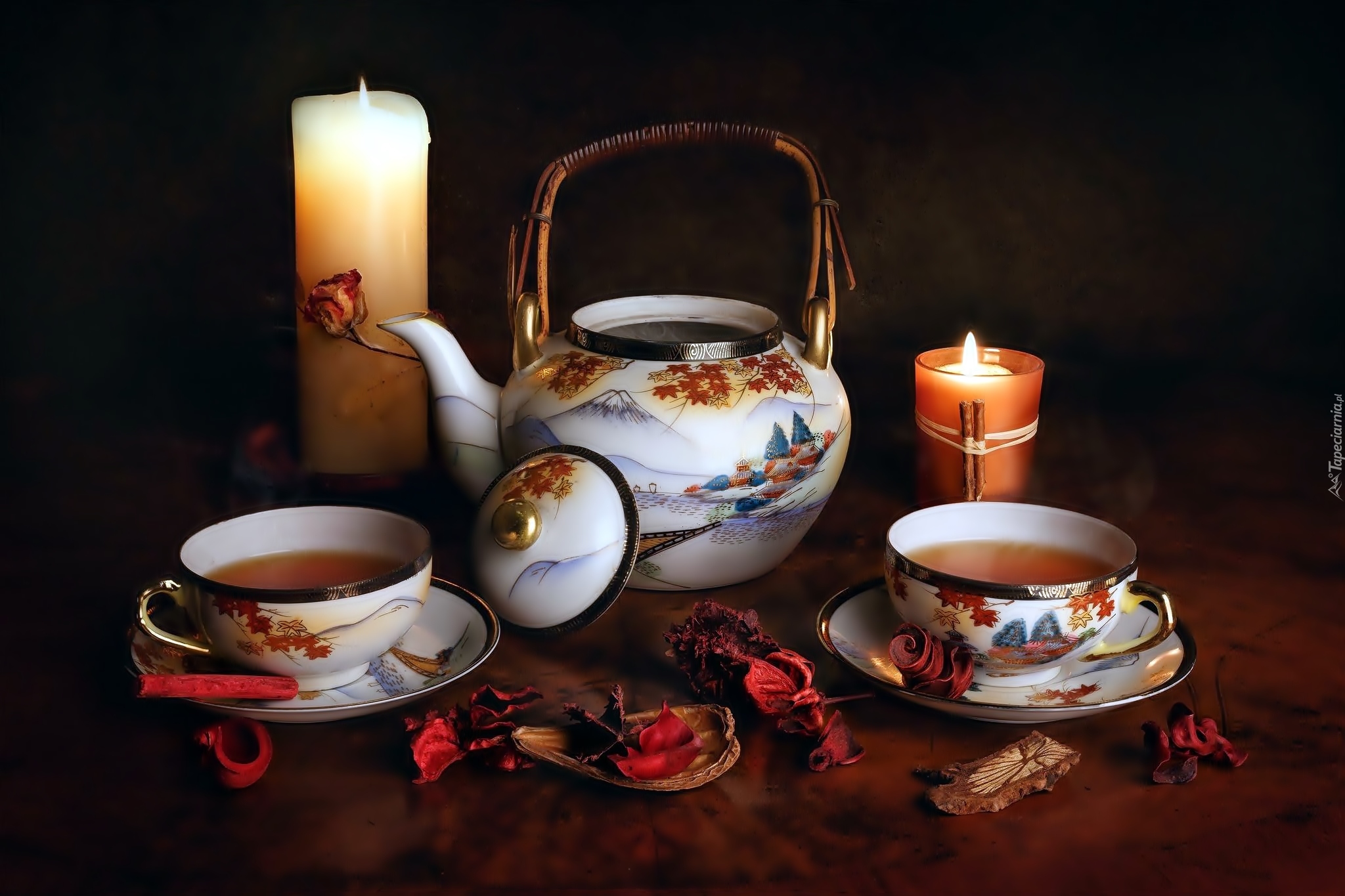 Edytor tapety: Filiżanki z herbatą obok świec i czajniczka