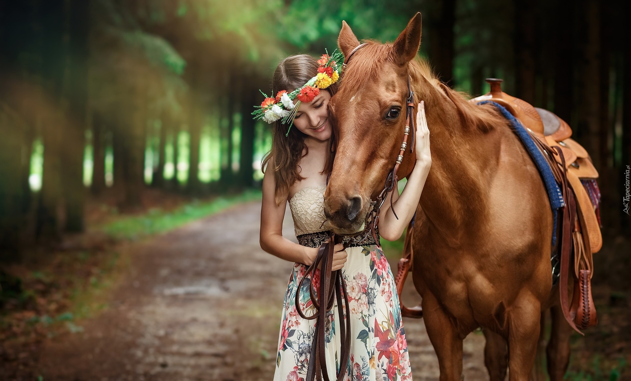 Edytor tapety: Dziewczyna w wianku na głowie przytulona do konia