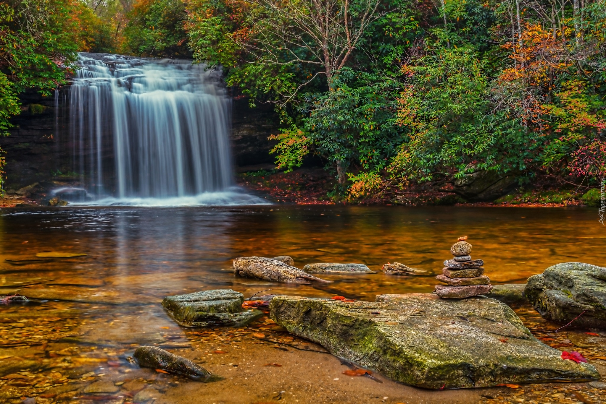 Edytor tapety: Woda spływająca po kamieniach w lesie