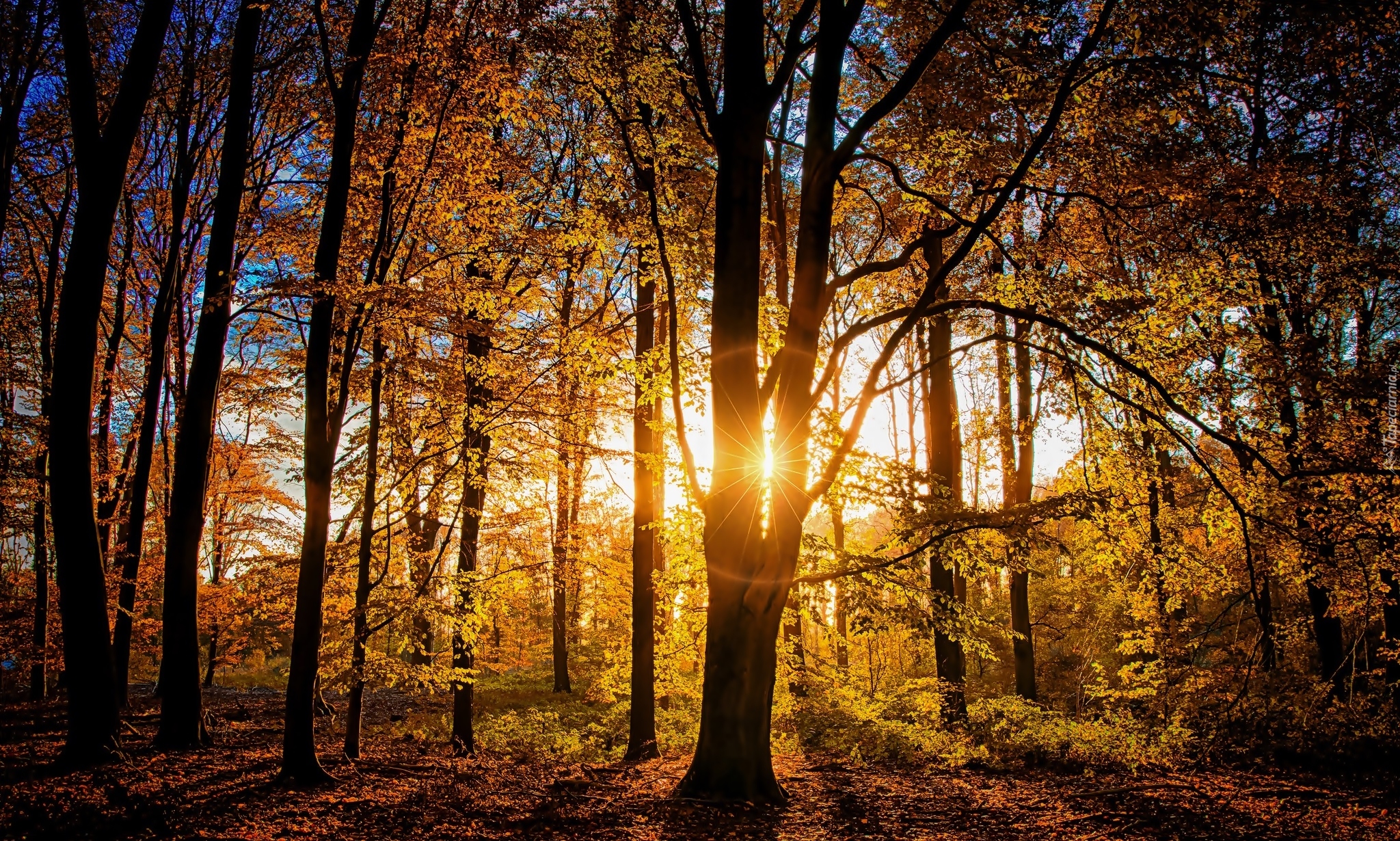 Edytor tapety: Promienie słońca między drzewami w jesiennym lesie