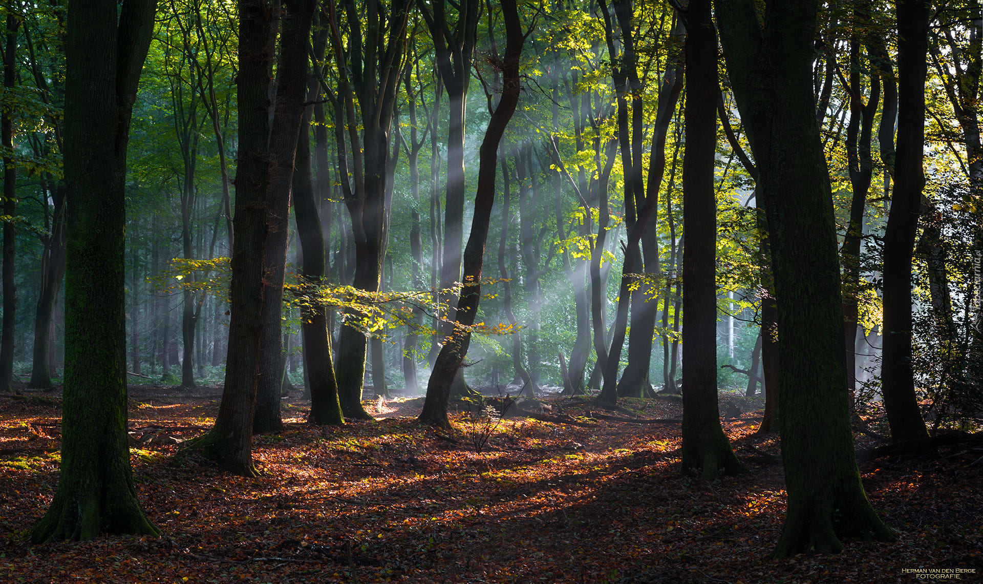 Edytor tapety: Przebijające światło słoneczne w lesie