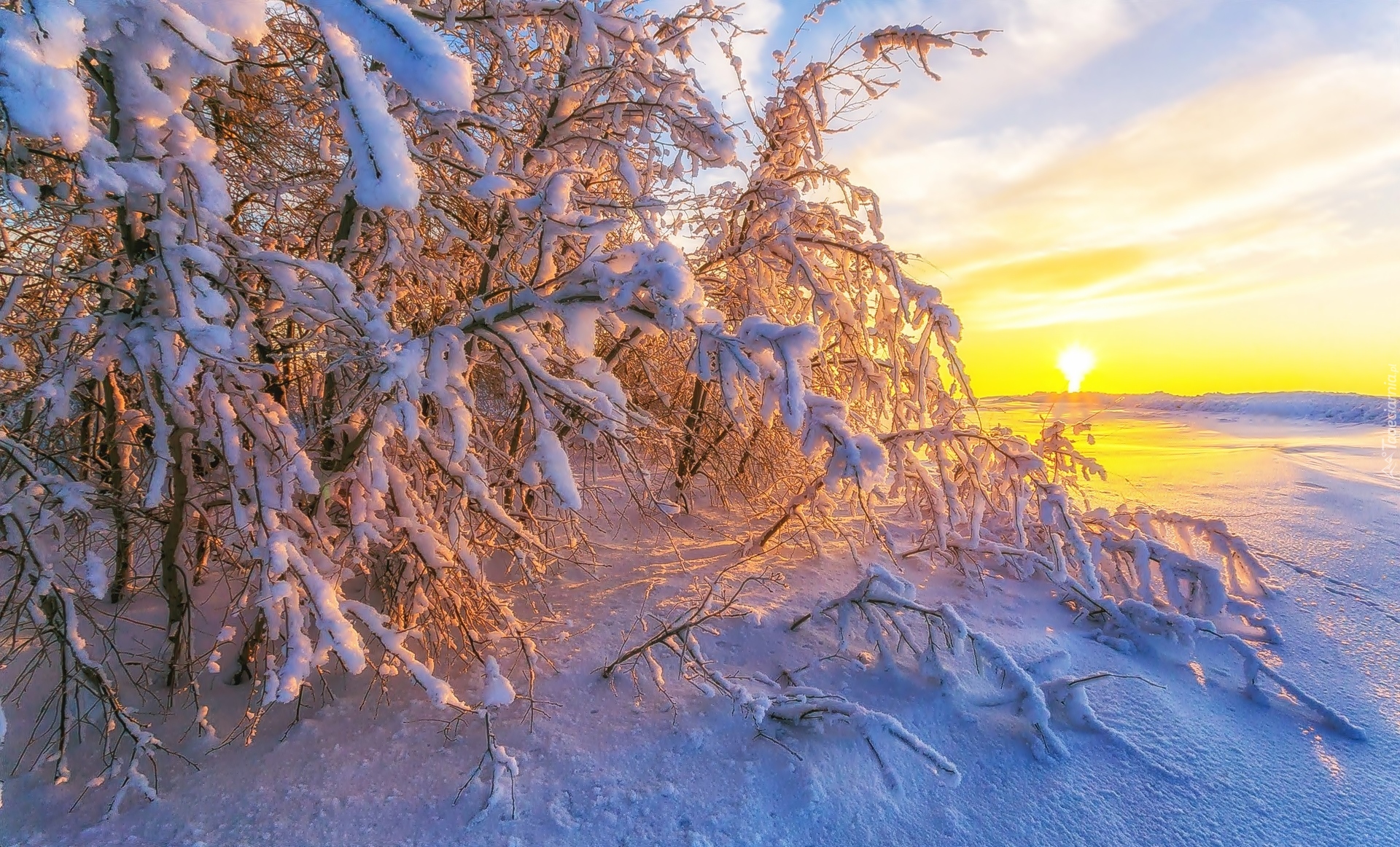 Edytor tapety: Ośnieżone gałęzie drzew w blasku wschodzącego słońca