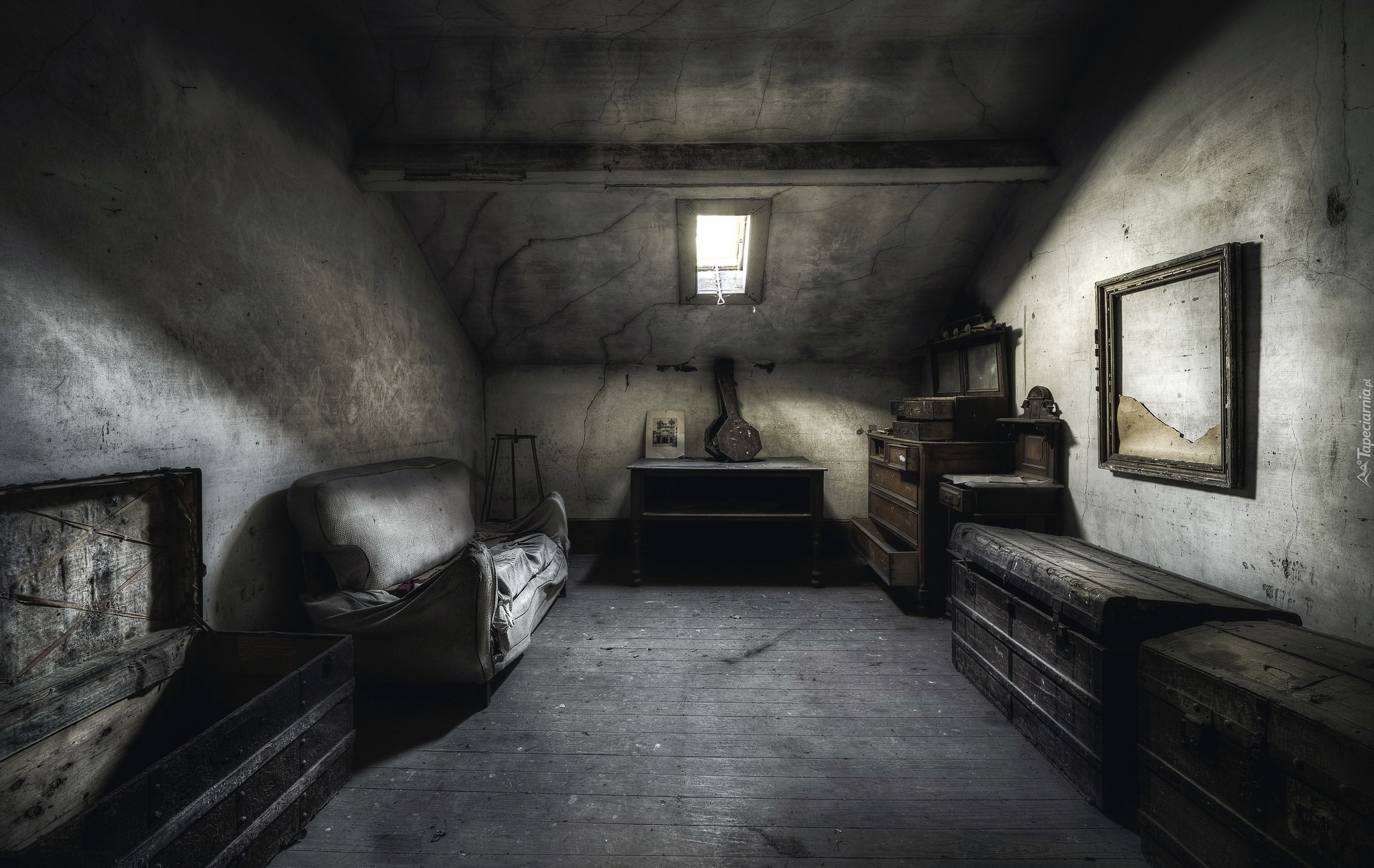 Edytor tapety: Stare zniszczone meble w ciemnym pomieszczeniu