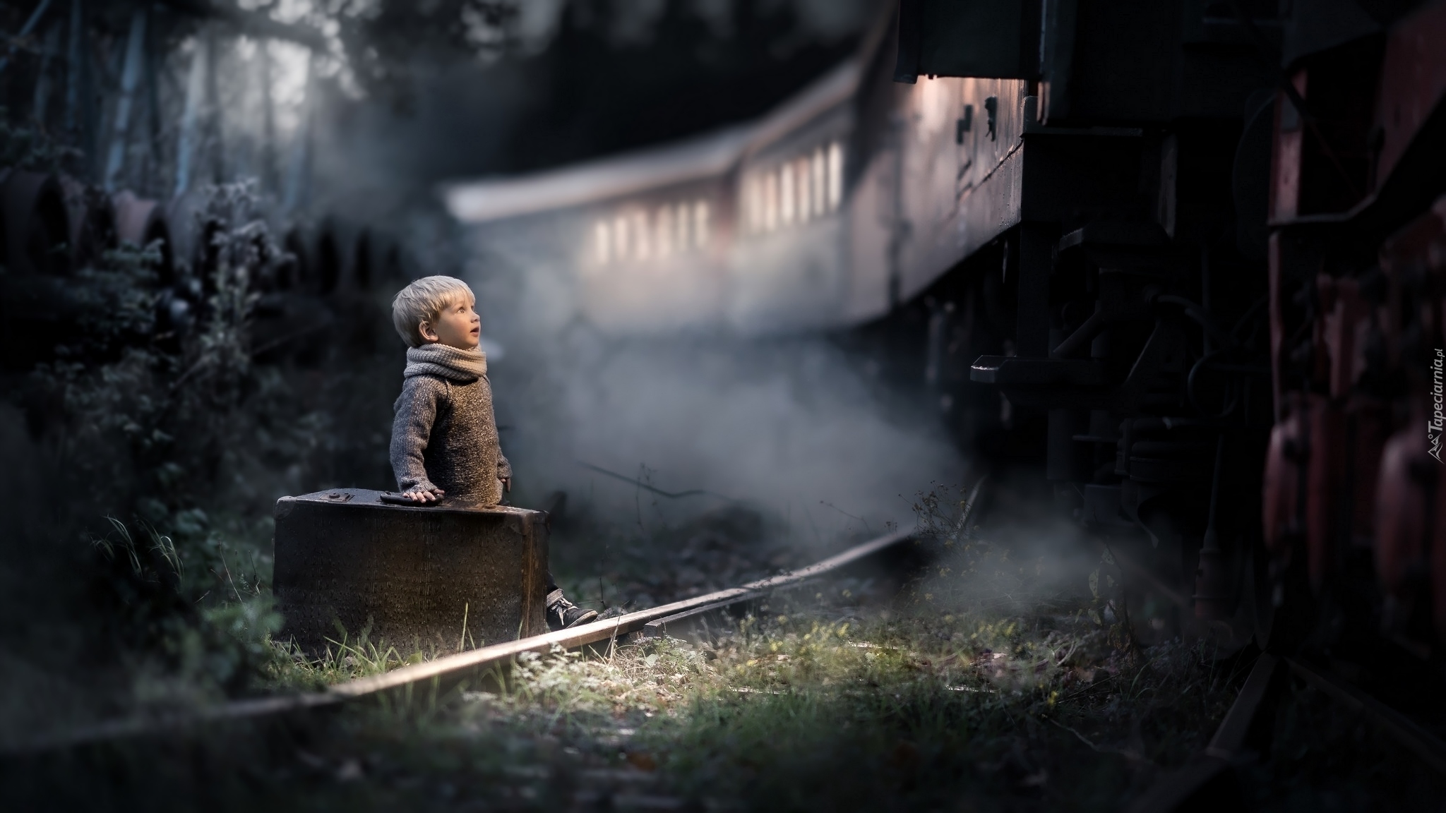 Edytor tapety: Chłopczyk z walizką obok torów kolejowych