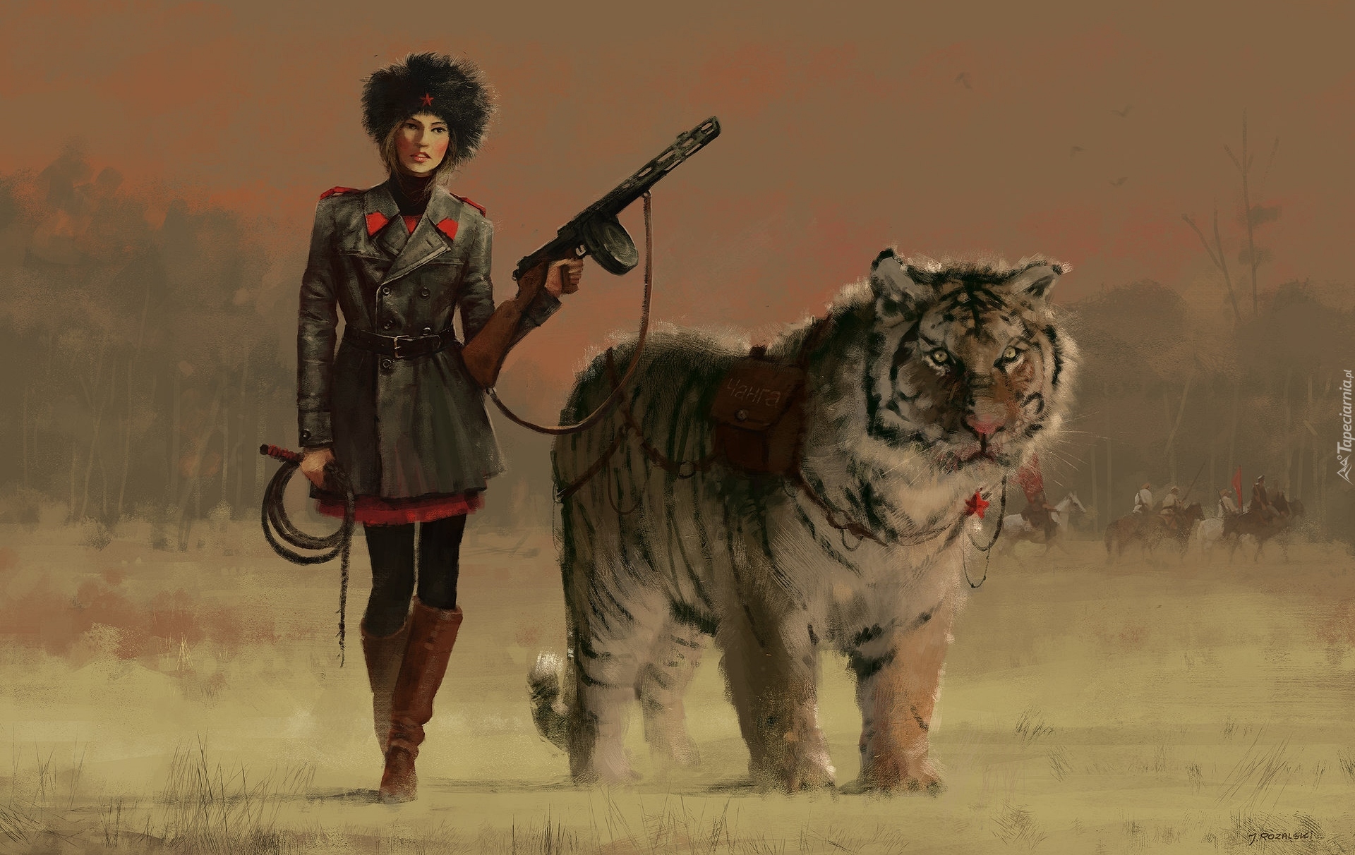 Edytor tapety: Kobieta z pistoletem maszynowym obok tygrysa