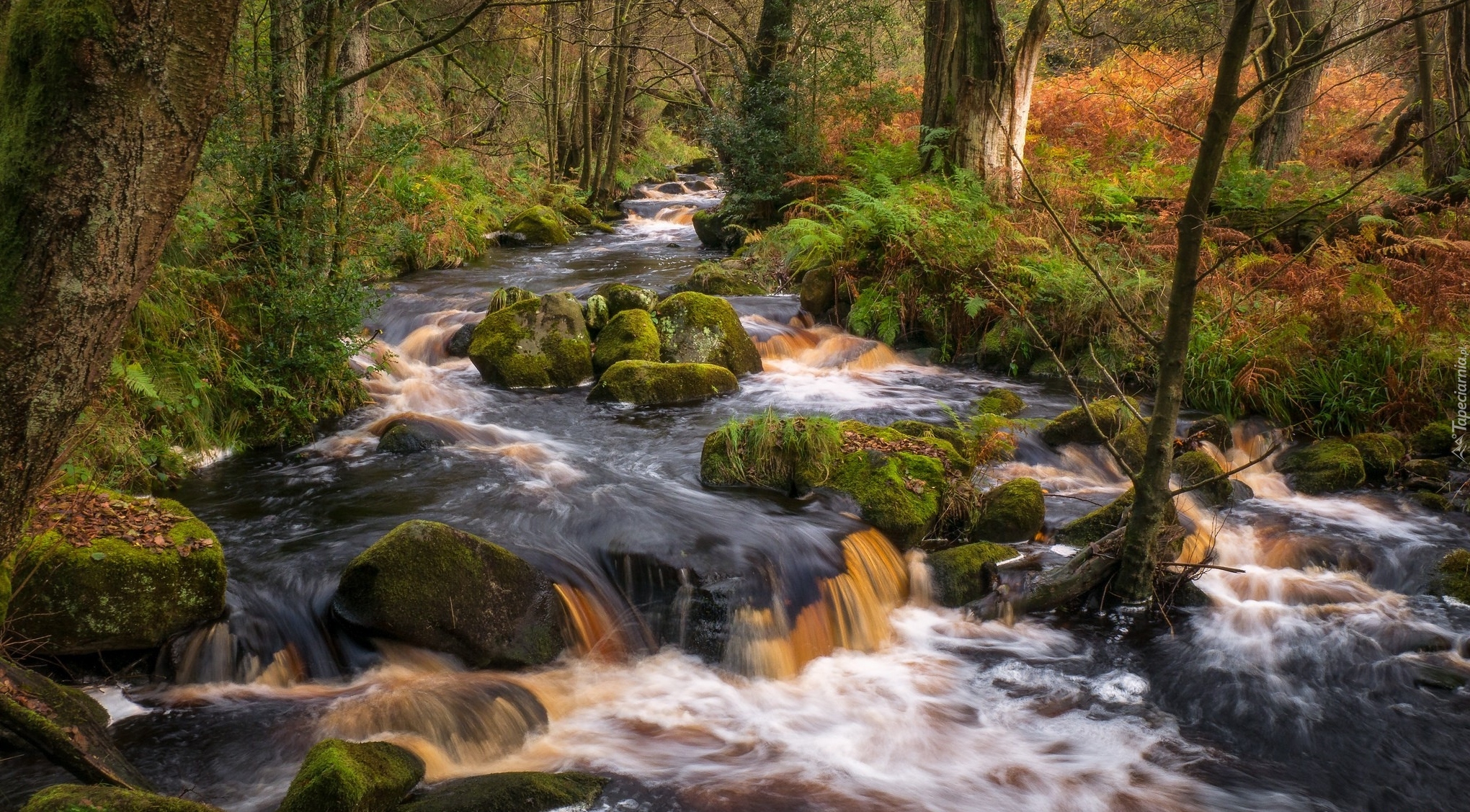 Edytor tapety: Leśna rzeka płynąca po omszałych kamieniach