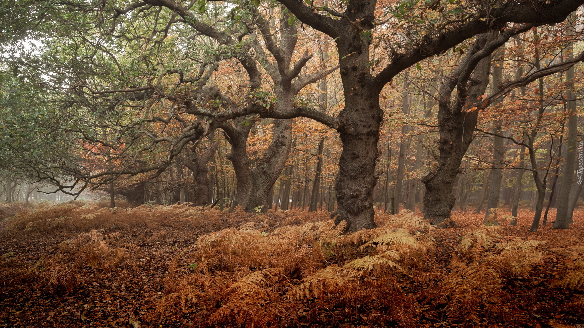 Edytor tapety: Uschnięte paprocie między drzewami w lesie