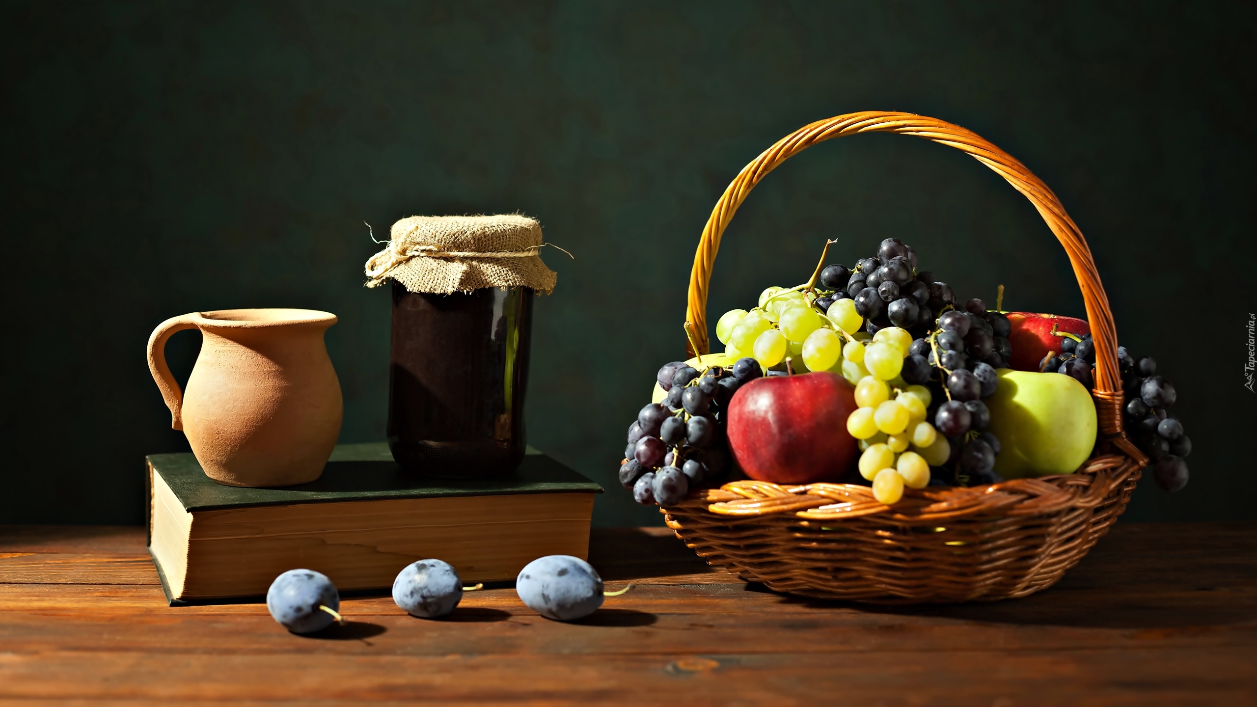 Edytor tapety: Koszyk owoców obok książki, dzbanuszka i słoika