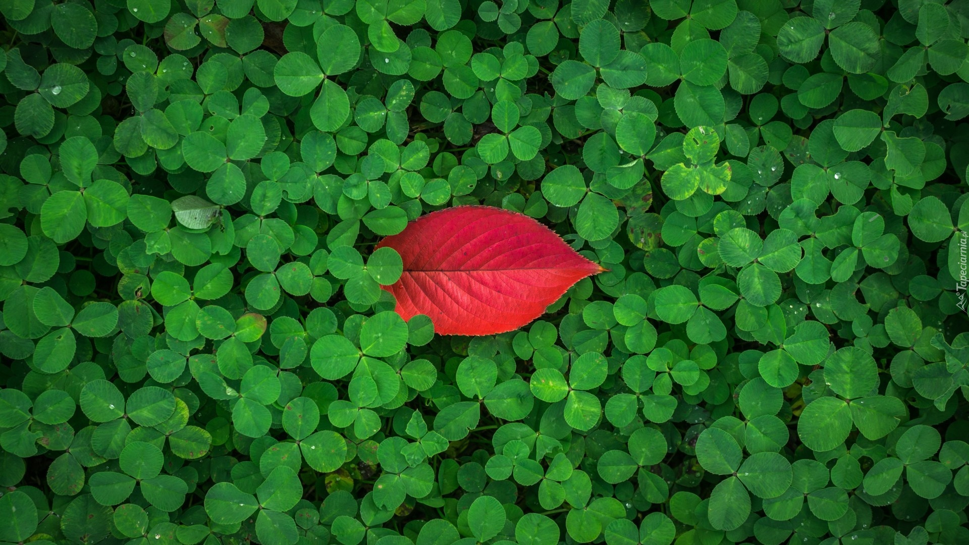 Edytor tapety: Czerwony liść na zielonych listkach koniczyny