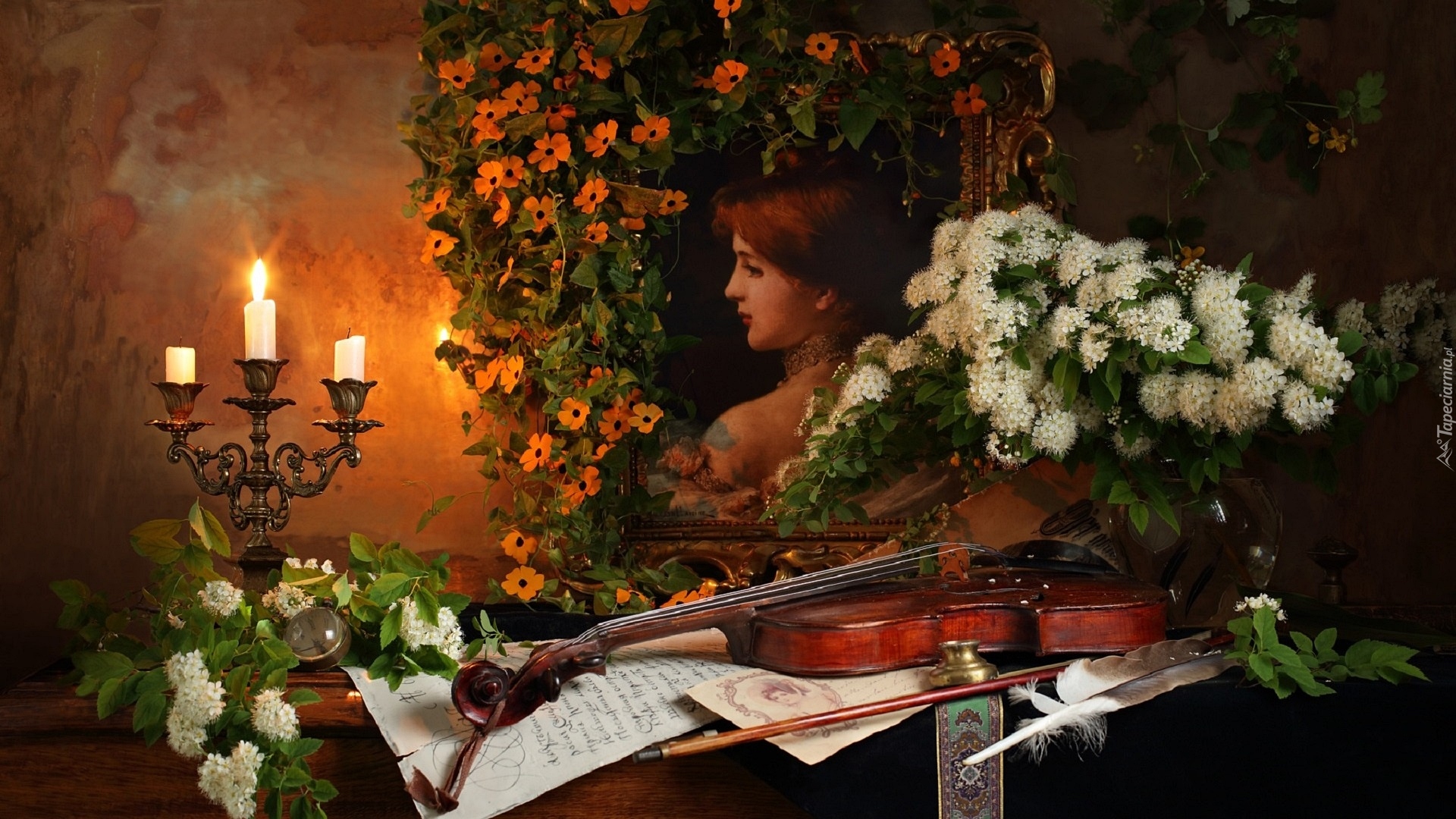 Edytor tapety: Skrzypce z nutami, świecznikiem i wazonem pod portretem