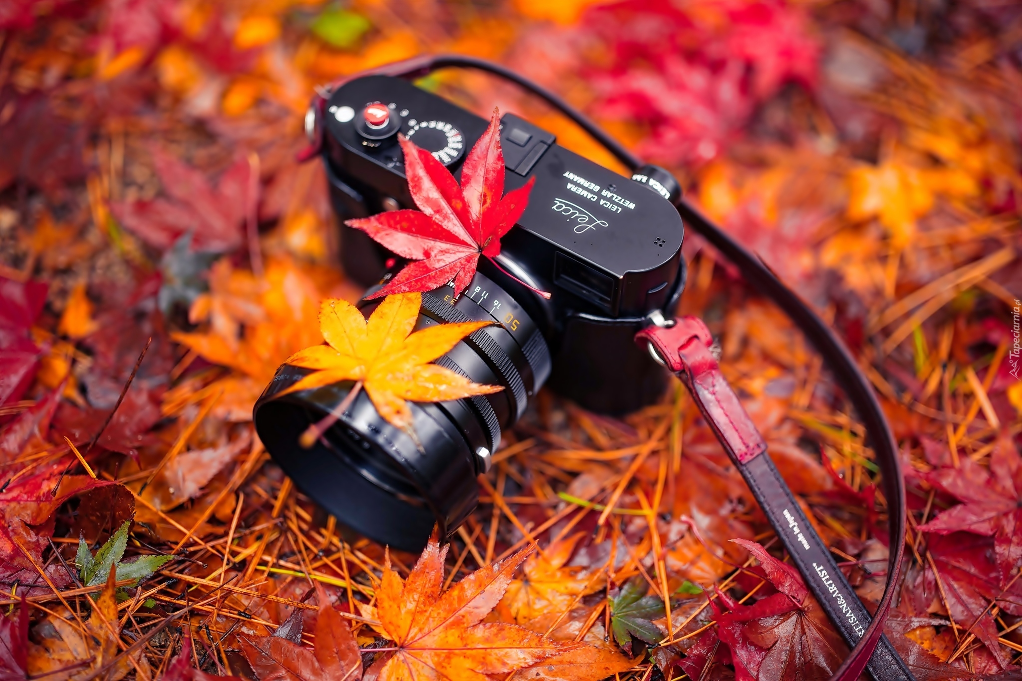 Edytor tapety: Aparat fotograficzny na liściach klonu