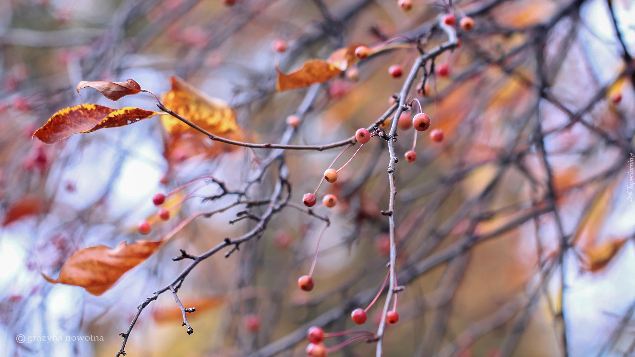 Edytor tapety: Czerwone owoce i usychajace liście na gałązkach