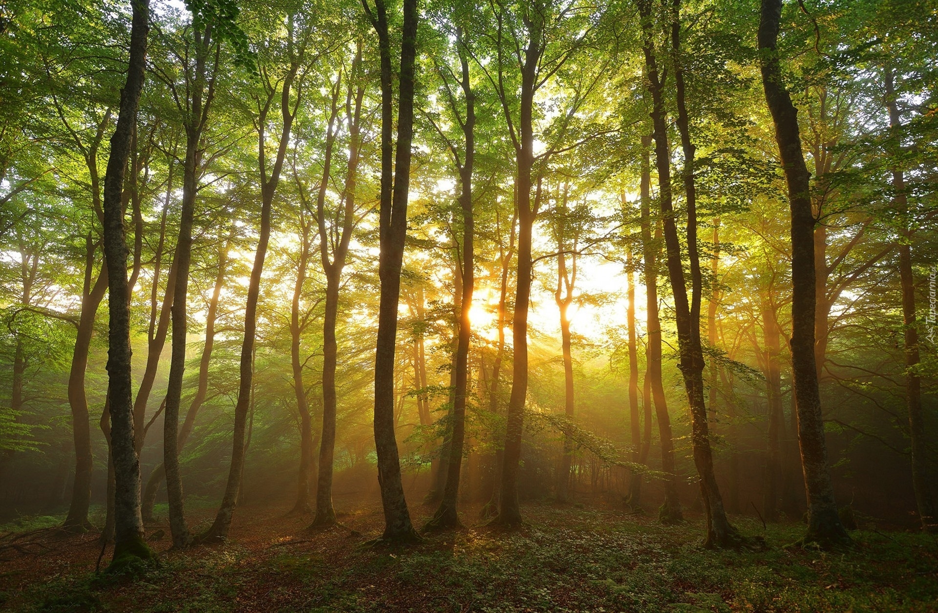 Edytor tapety: Promienie słoneczne pomiędzy drzewami w lesie