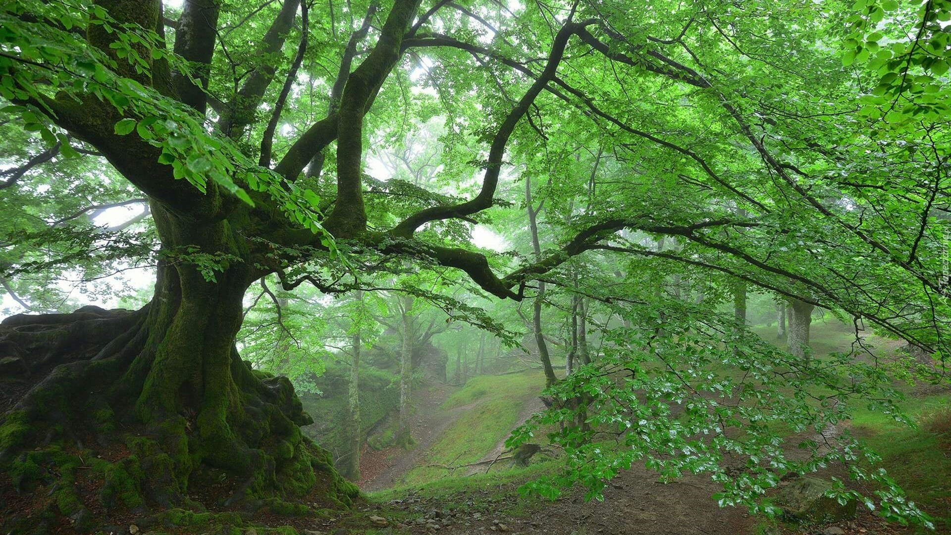 Edytor tapety: Omszałe drzewa otulone mgłą w lesie