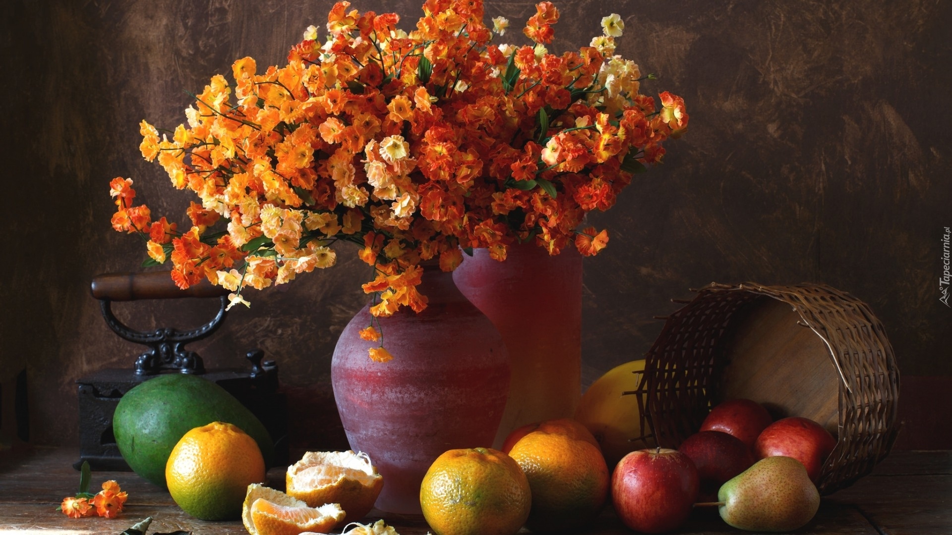 Edytor tapety: Jabłka i pomarańcze obok wazonu z kwiatami